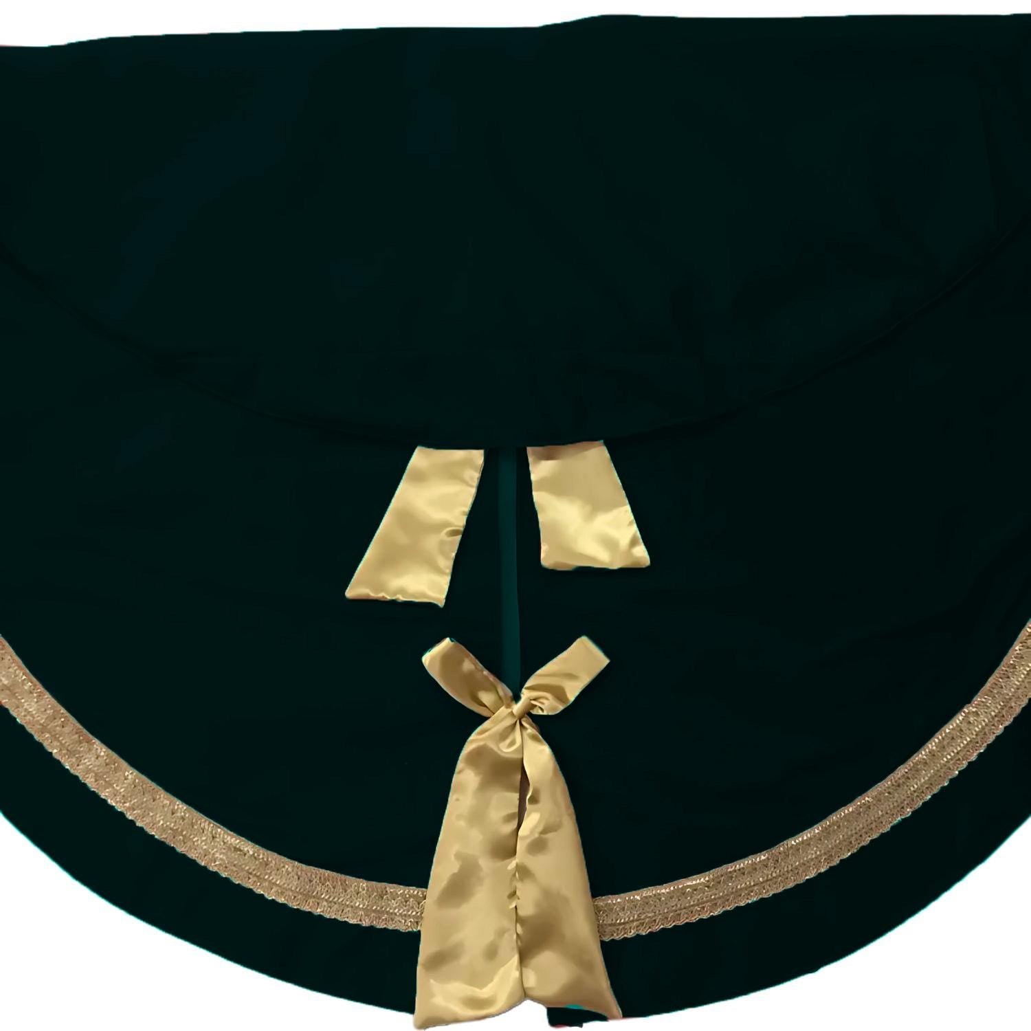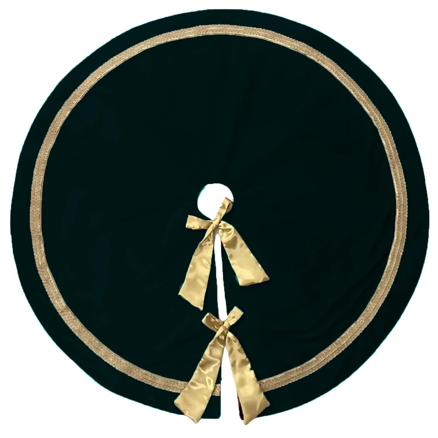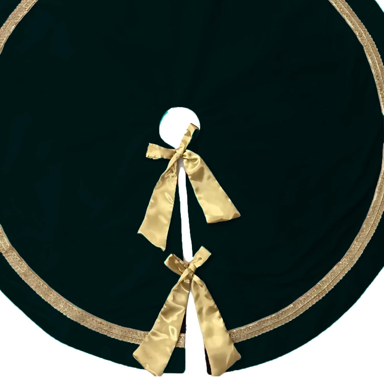 Made of double layer classic micro bottle green Velvet fabric and gold border. Tree skirt with beautiful hand made satin bow tie.