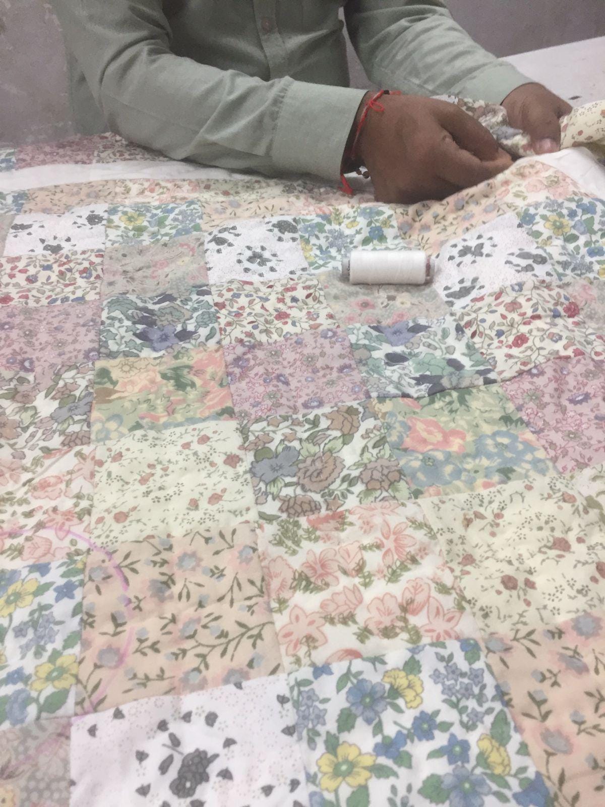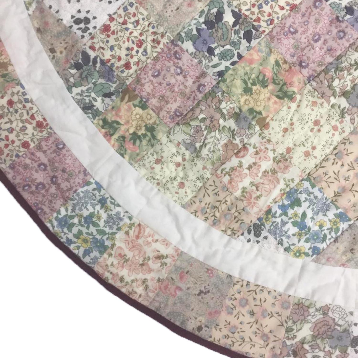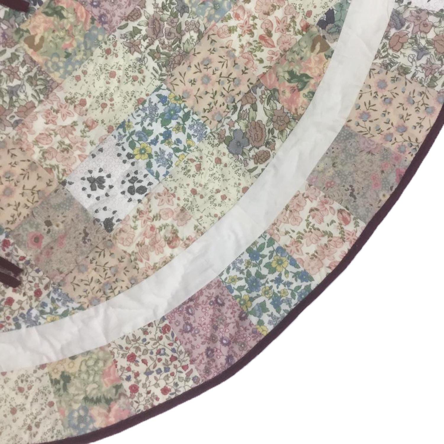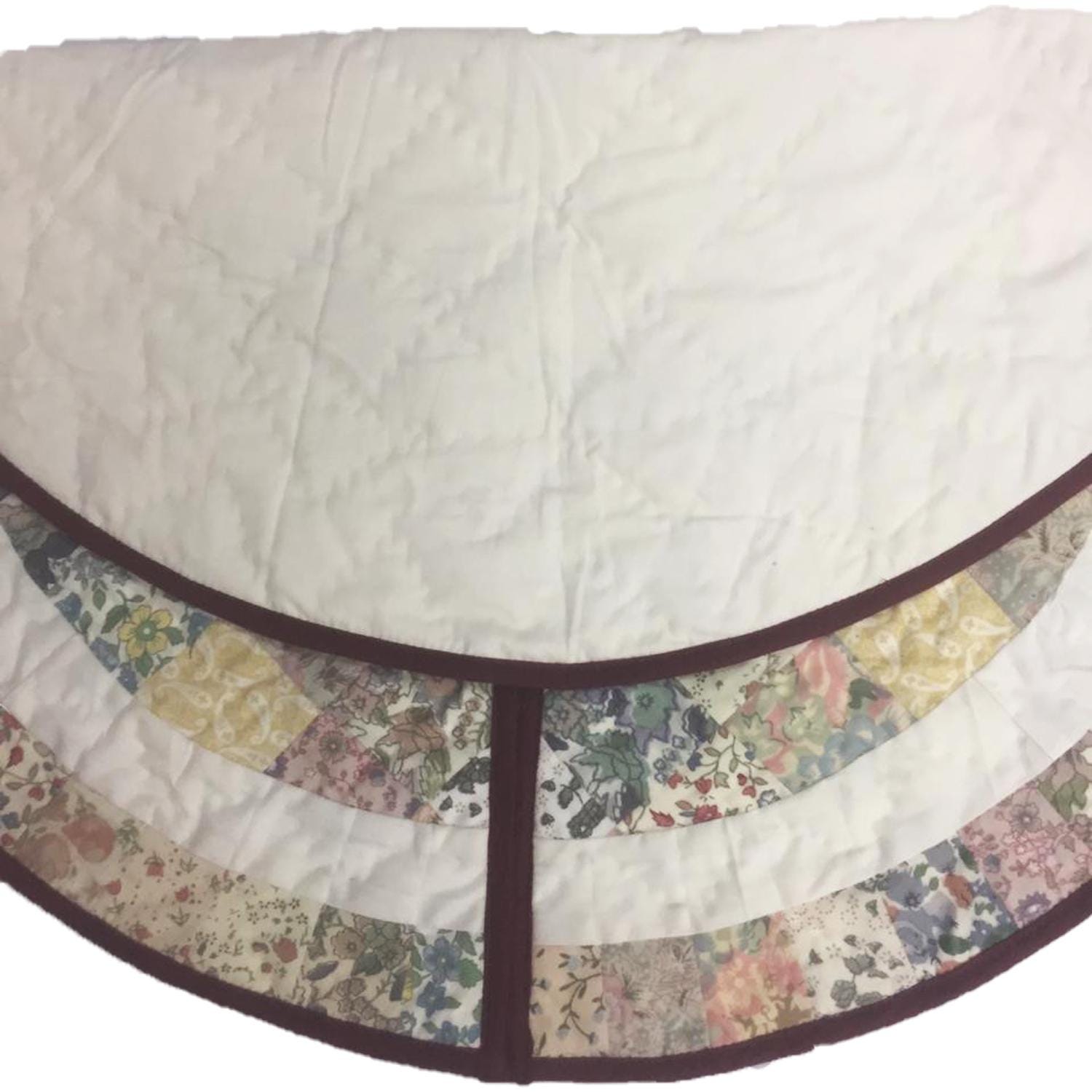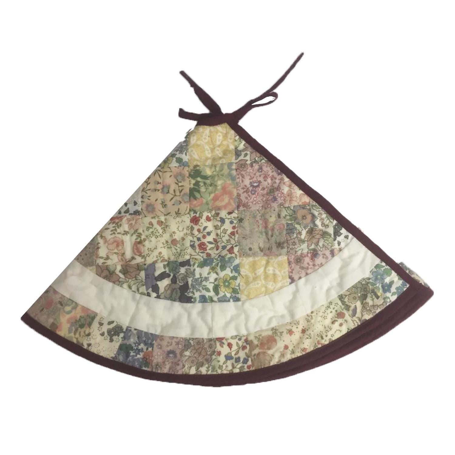 Made of double layer multi floral print and ecru fabric patchwork quilted cotton tree skirt. Tree skirt with tie.