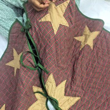 Made of double-layer cotton red-green check fabric, with stars crafted from beige fabric and hand-quilted on it. The tree skirt features a beautiful handmade double tie. A cotton layer inside the tree skirt enhances the look with attractive machine quilting. Stars are neatly hand-quilted on the tree skirt.