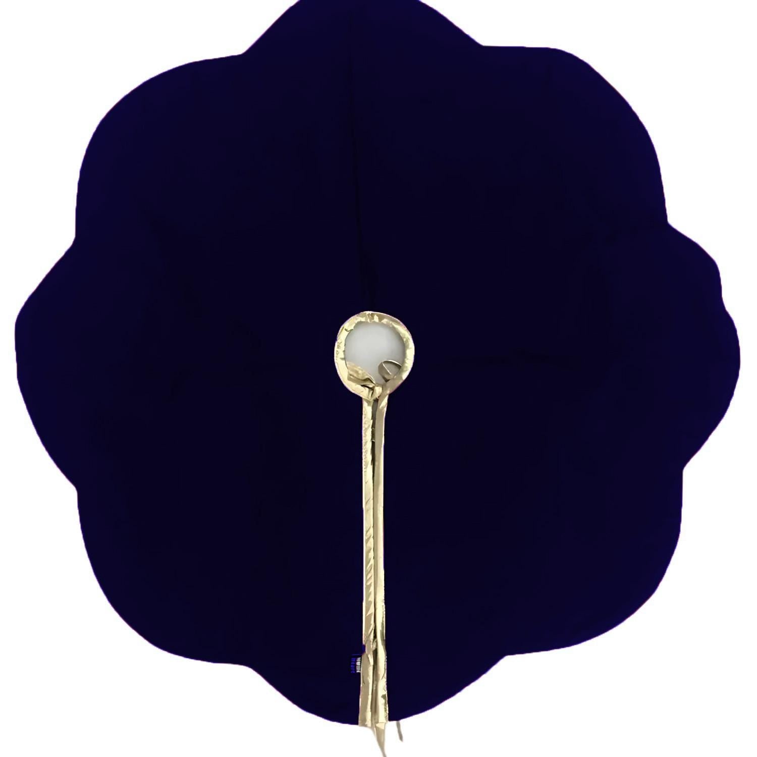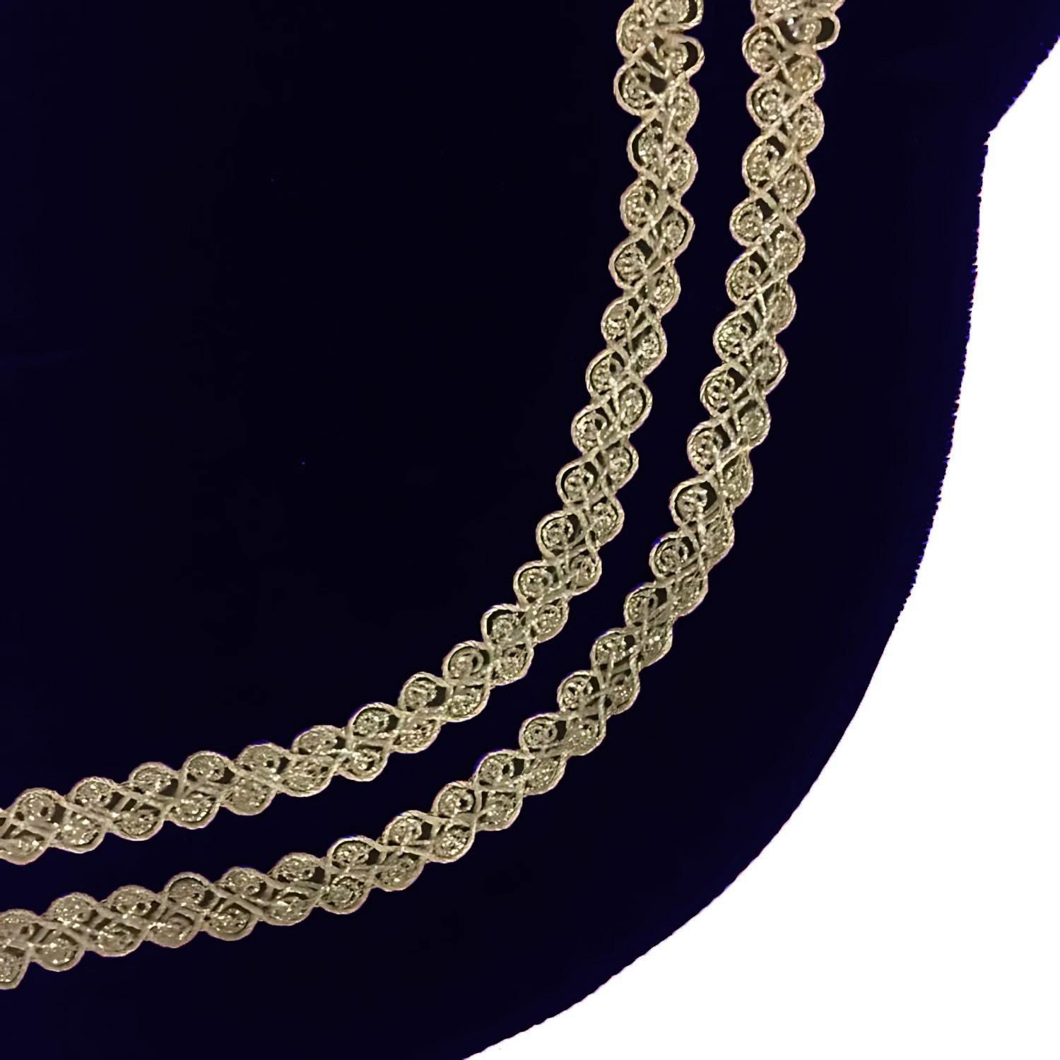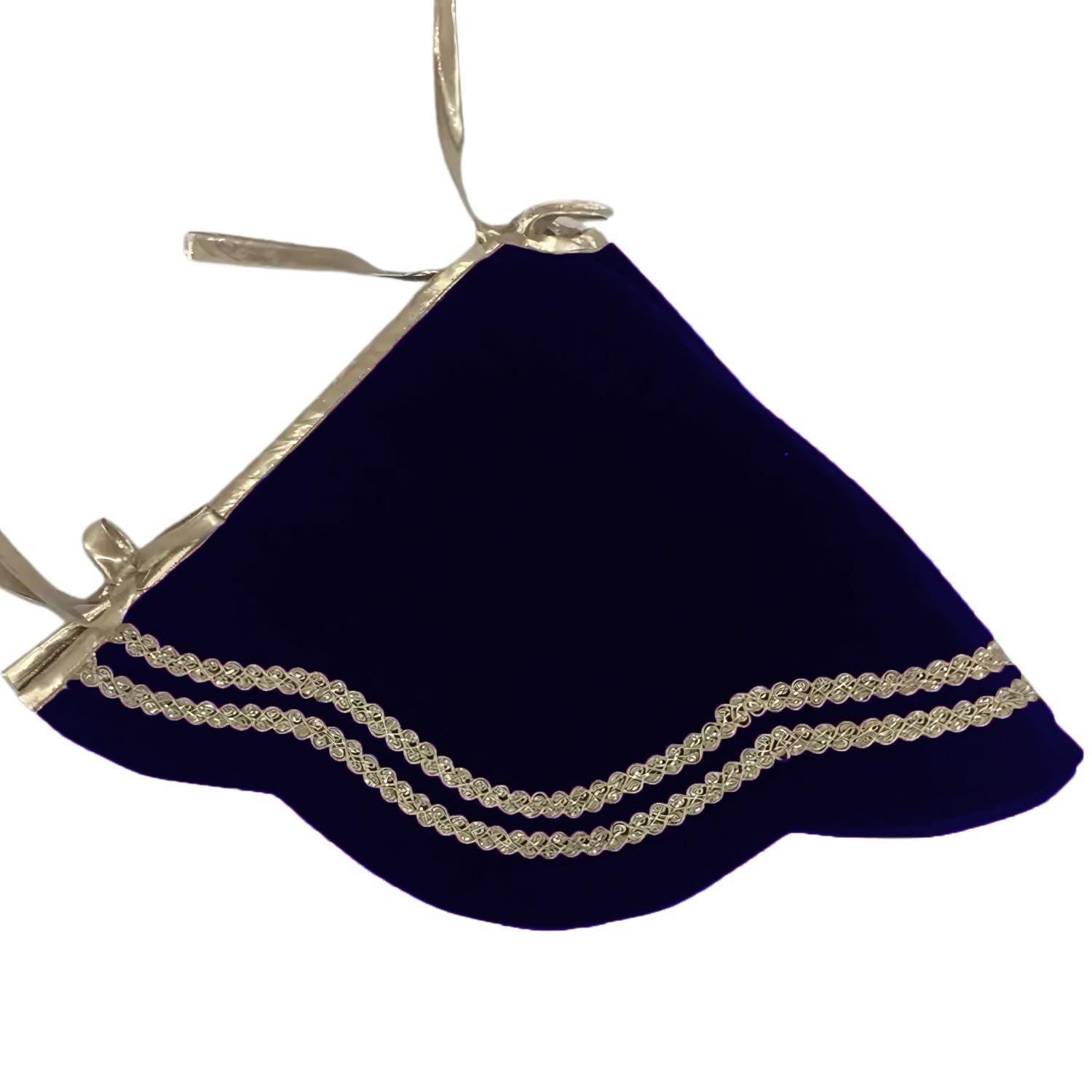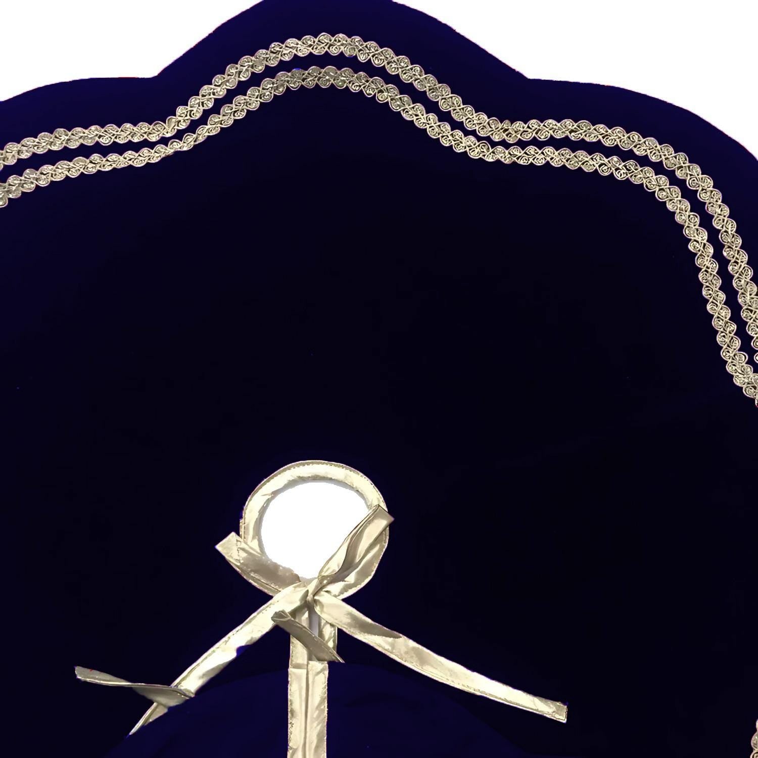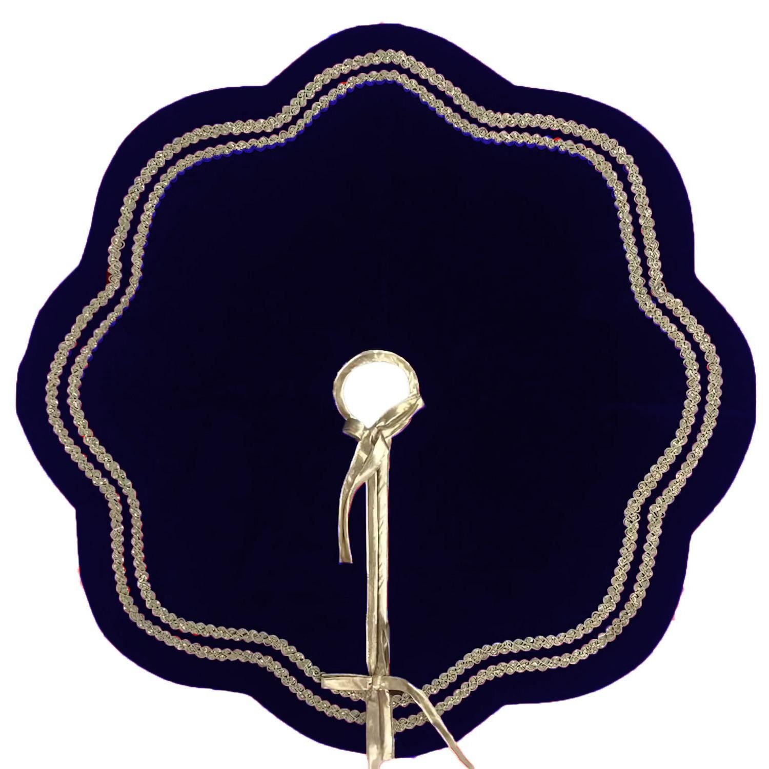 Add a touch of elegance to your holiday décor with this exquisite, handcrafted Christmas tree skirt. Made from rich, luxurious navy blue velvet, it features a stunning scalloped edge, adorned with a sophisticated silver trim and border that elevates its festive appeal. Backing is satin feel soft fabric.