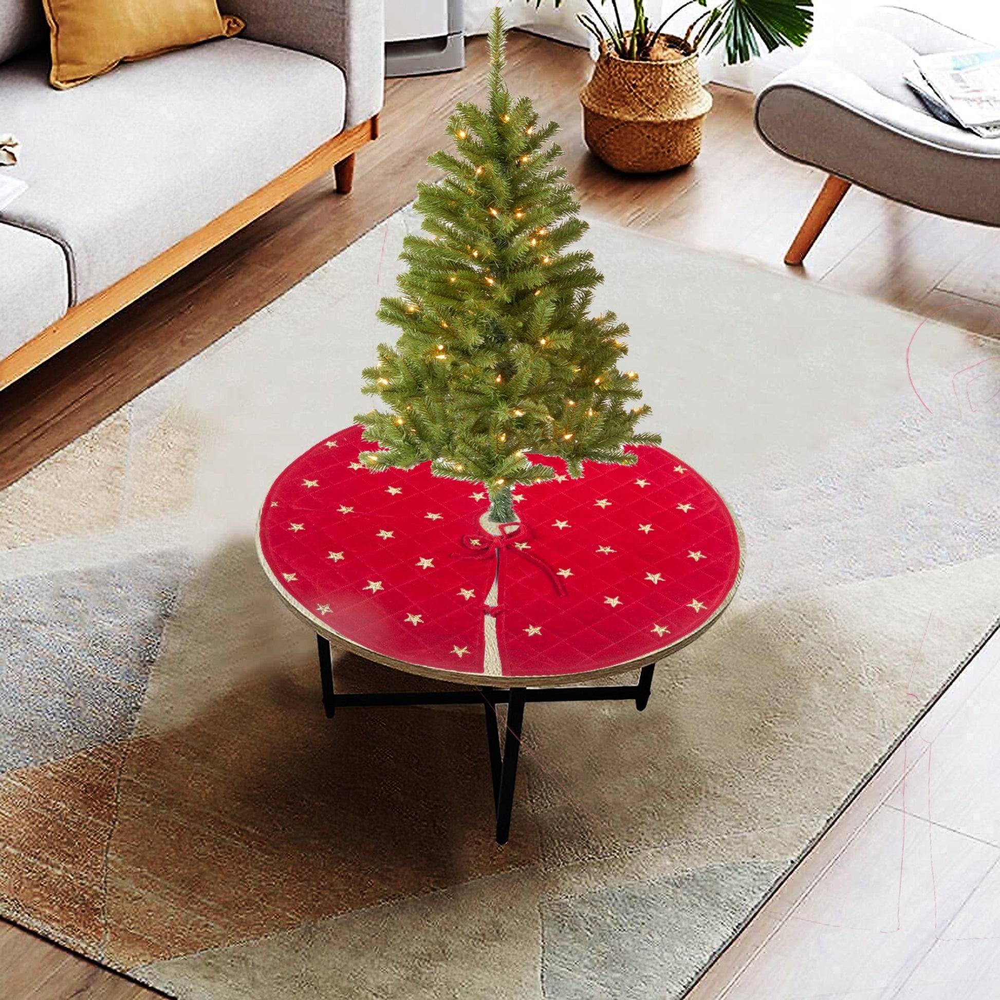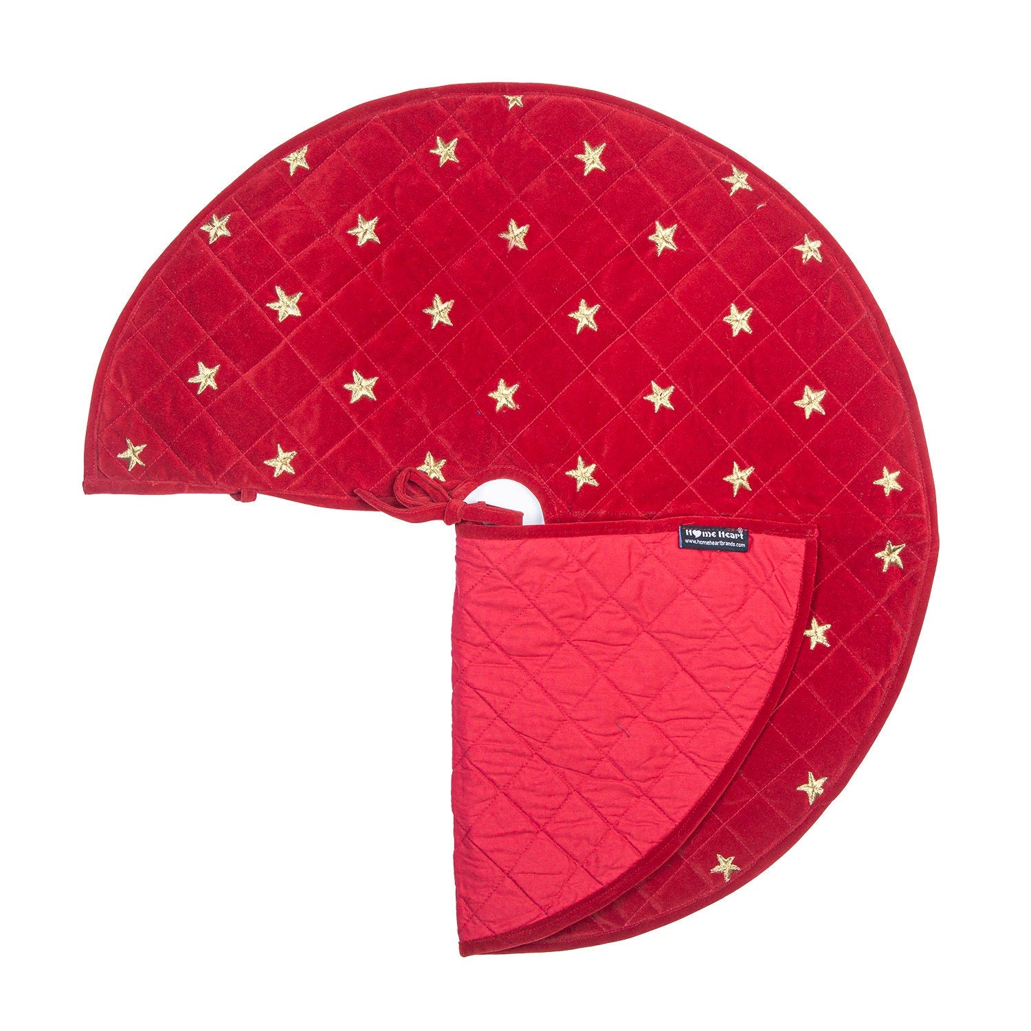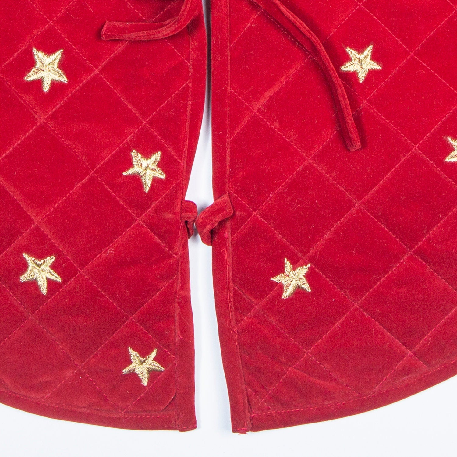 Made of double layer quilted classic micro red velvet fabric and gold star embroidered on it. Tree skirt with tie.