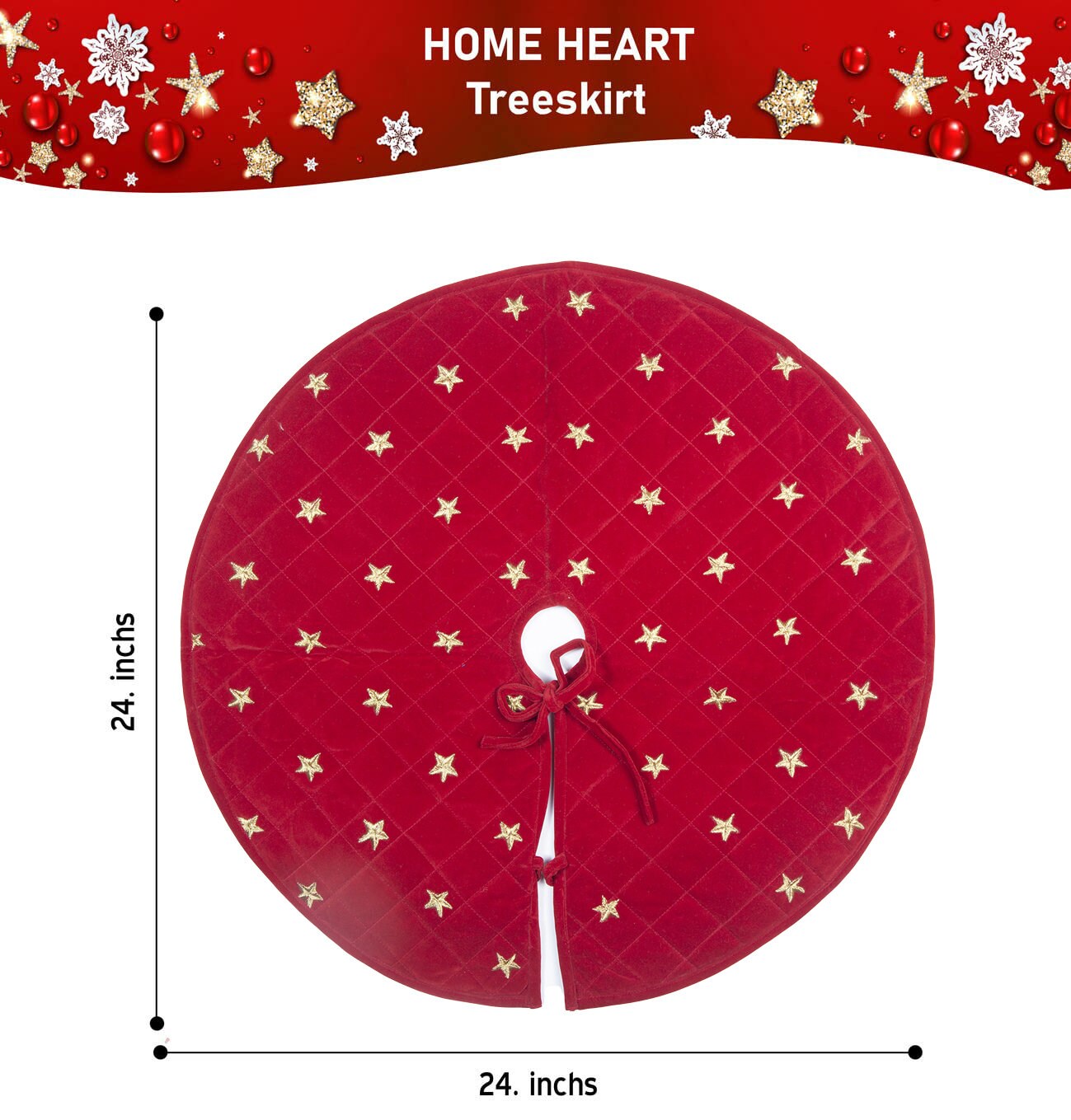 Christmas tree skirt micro red Velvet Quilted fabric and gold star embroidered on it. Thick Double Layer quilted by HOME HEART Brands