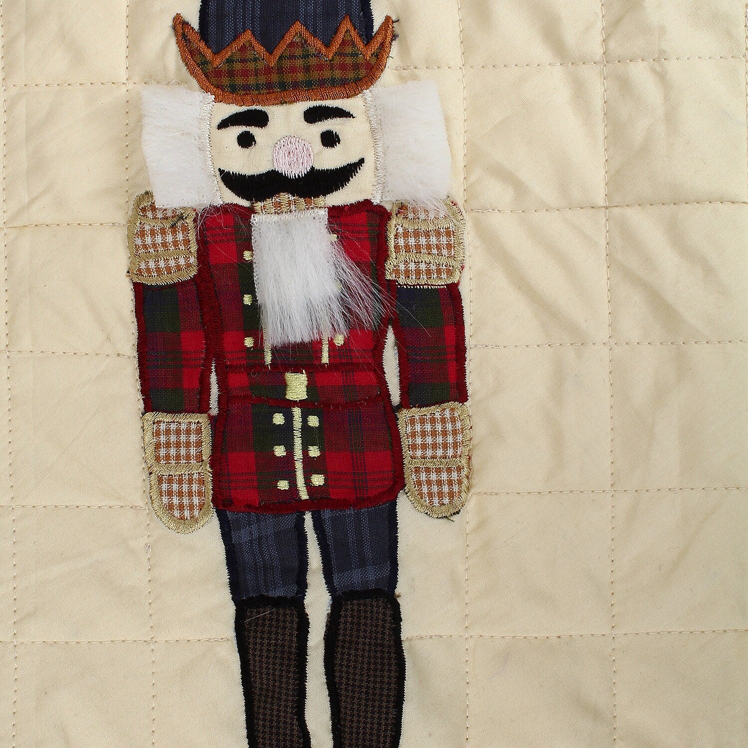 Made of multi-color plaid cotton fabric with Christmas Colors appliqued embroidered Nutcrackers on a beige background.