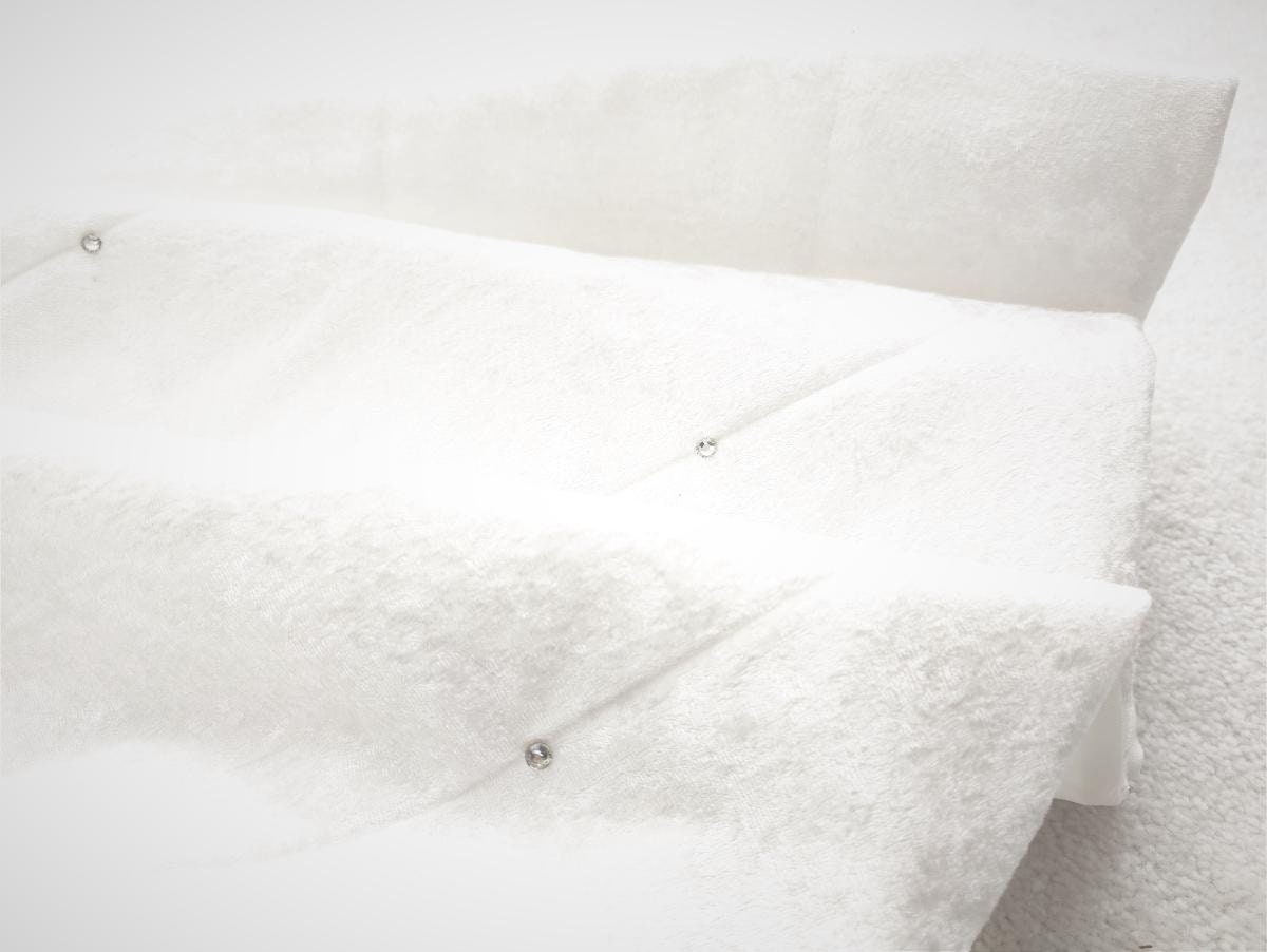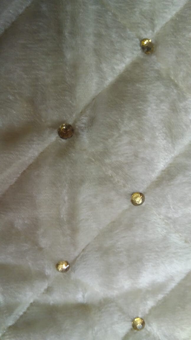Made of double layer quilted classic snow white velvet fabric and hand crafted gold beaded on it. Tree skirt with tie.