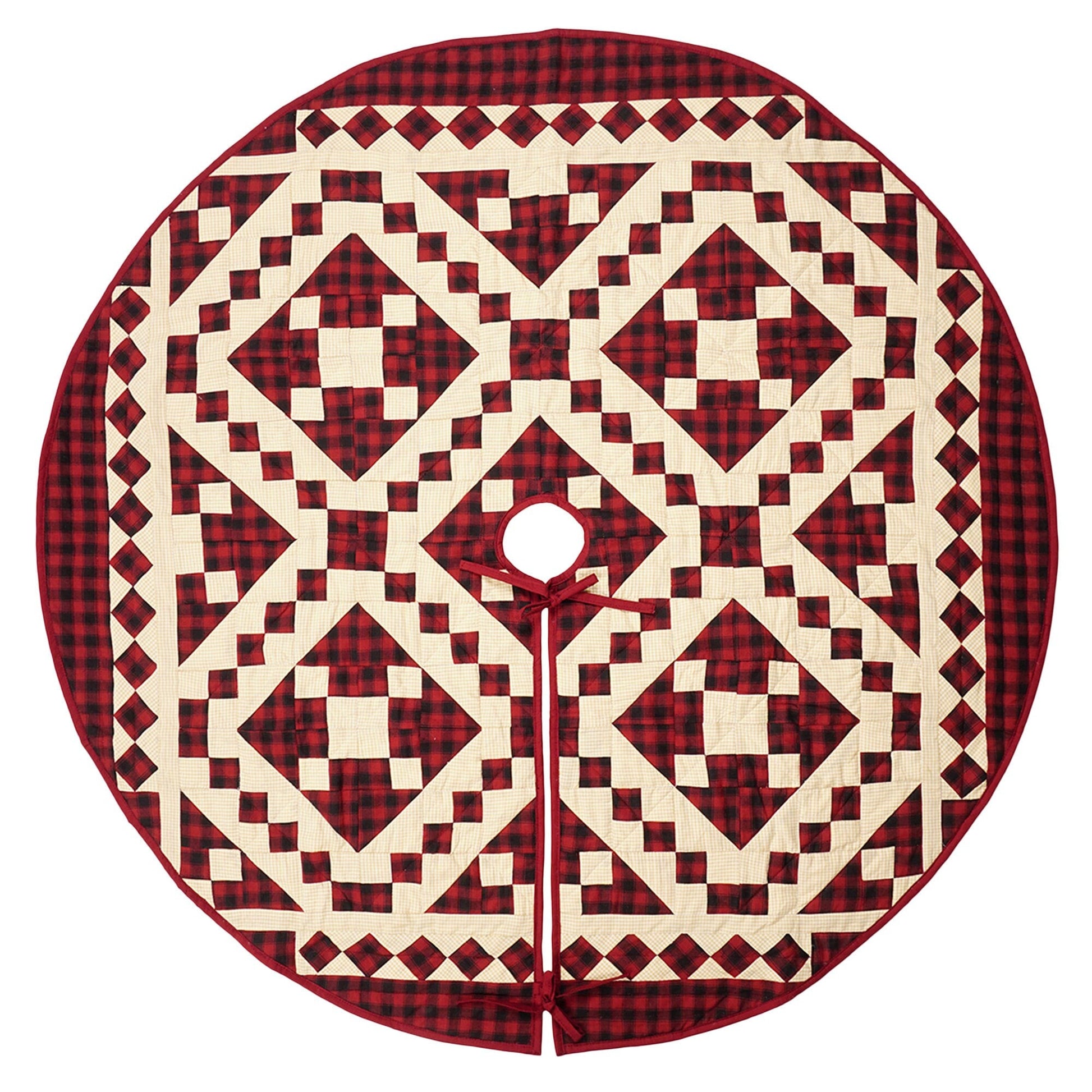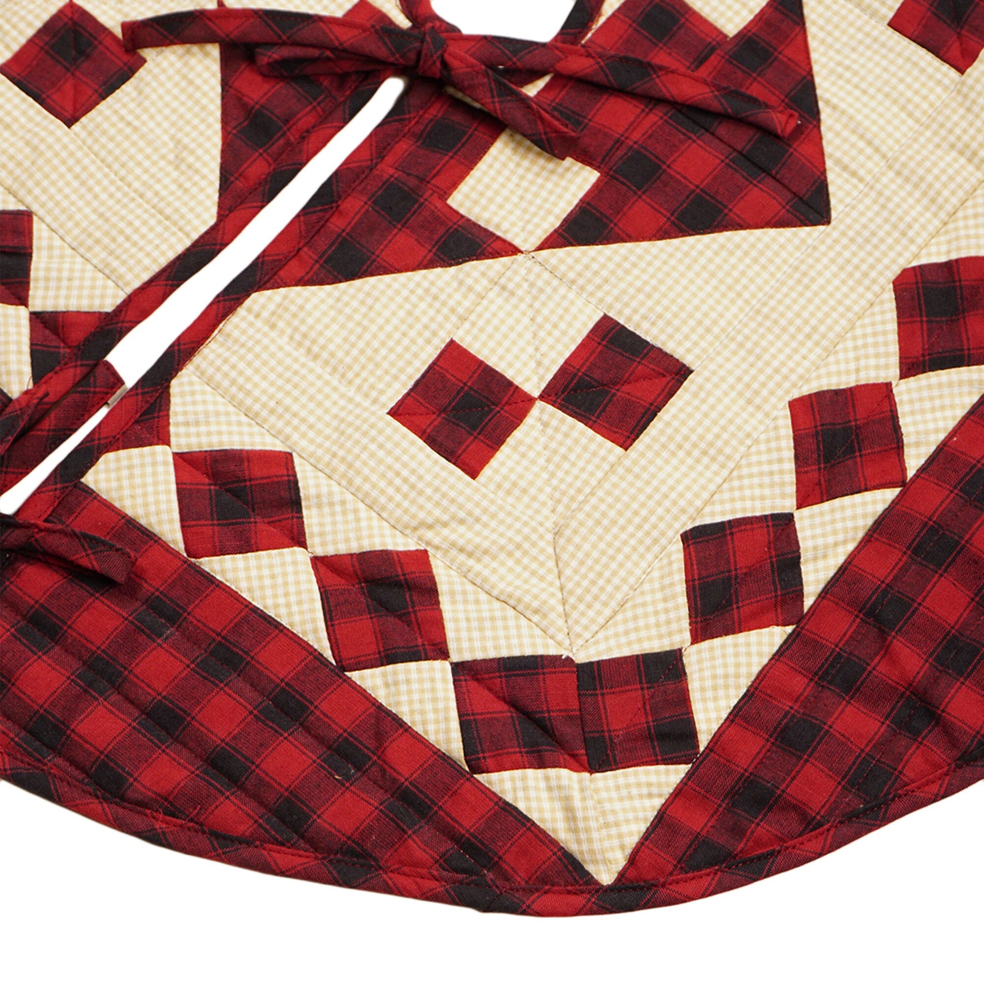 Made of double layer patchwork quilted Cranberry Red and beige Calico cotton fabric, creating a Diamond and Squares cotton tree skirt.