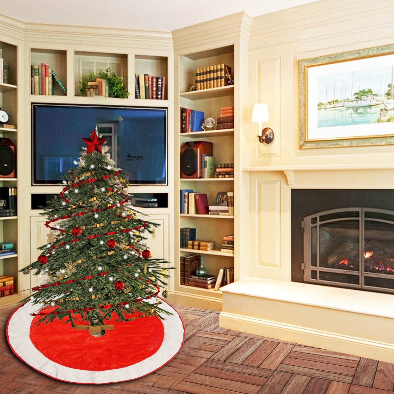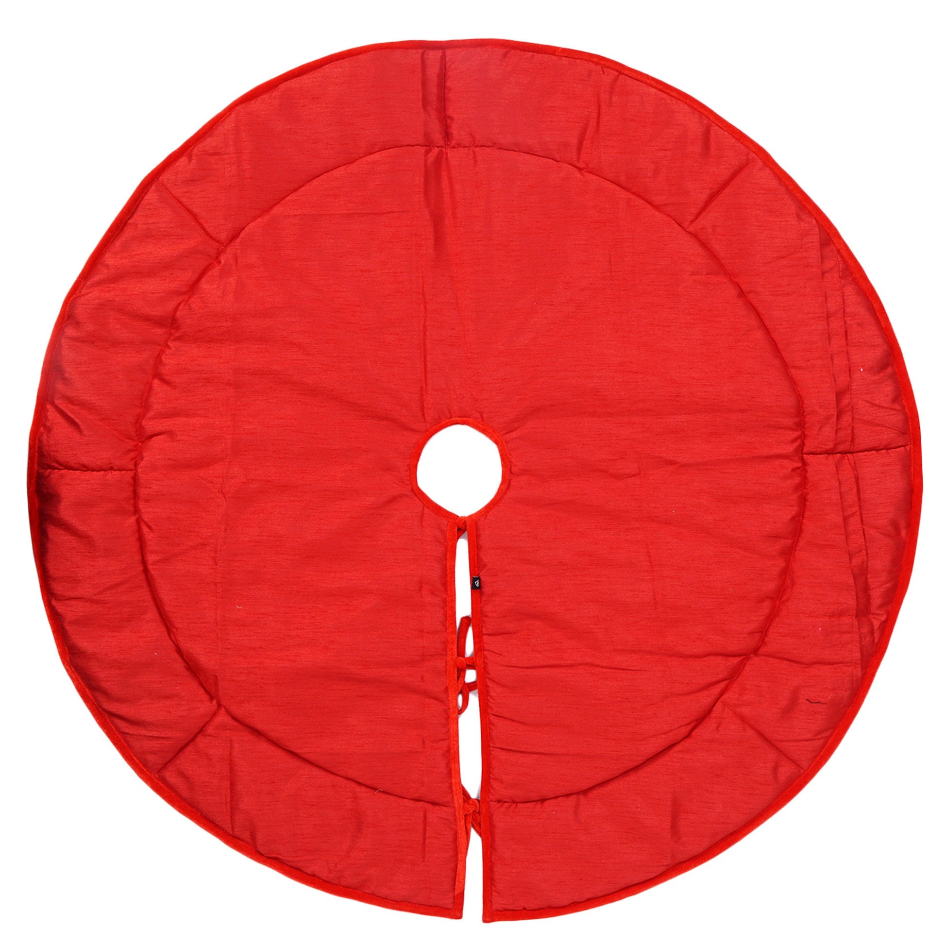 Made of double layer classic  christmas red micro Velvet fabric and ivory lurex burlap border fabric.        Tree skirt with  beautiful hand made double tie.