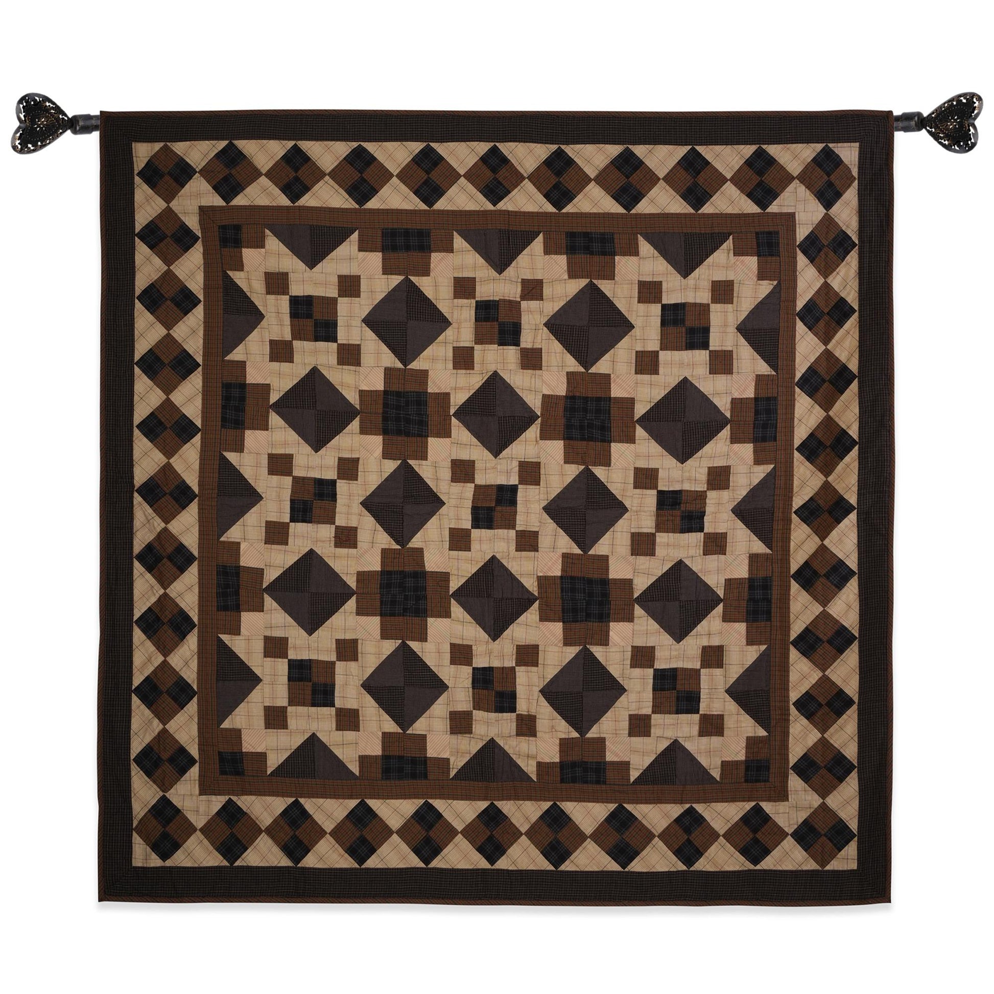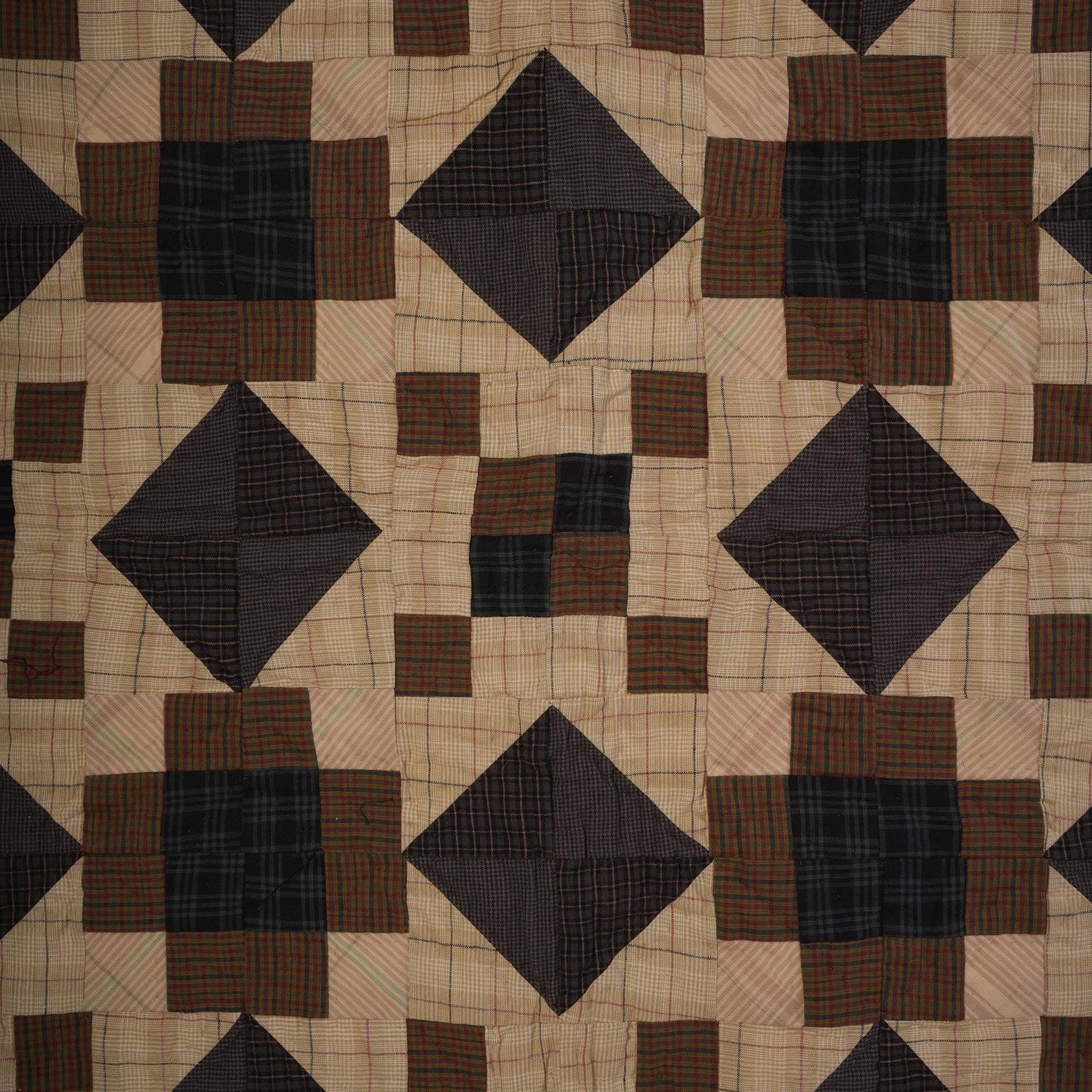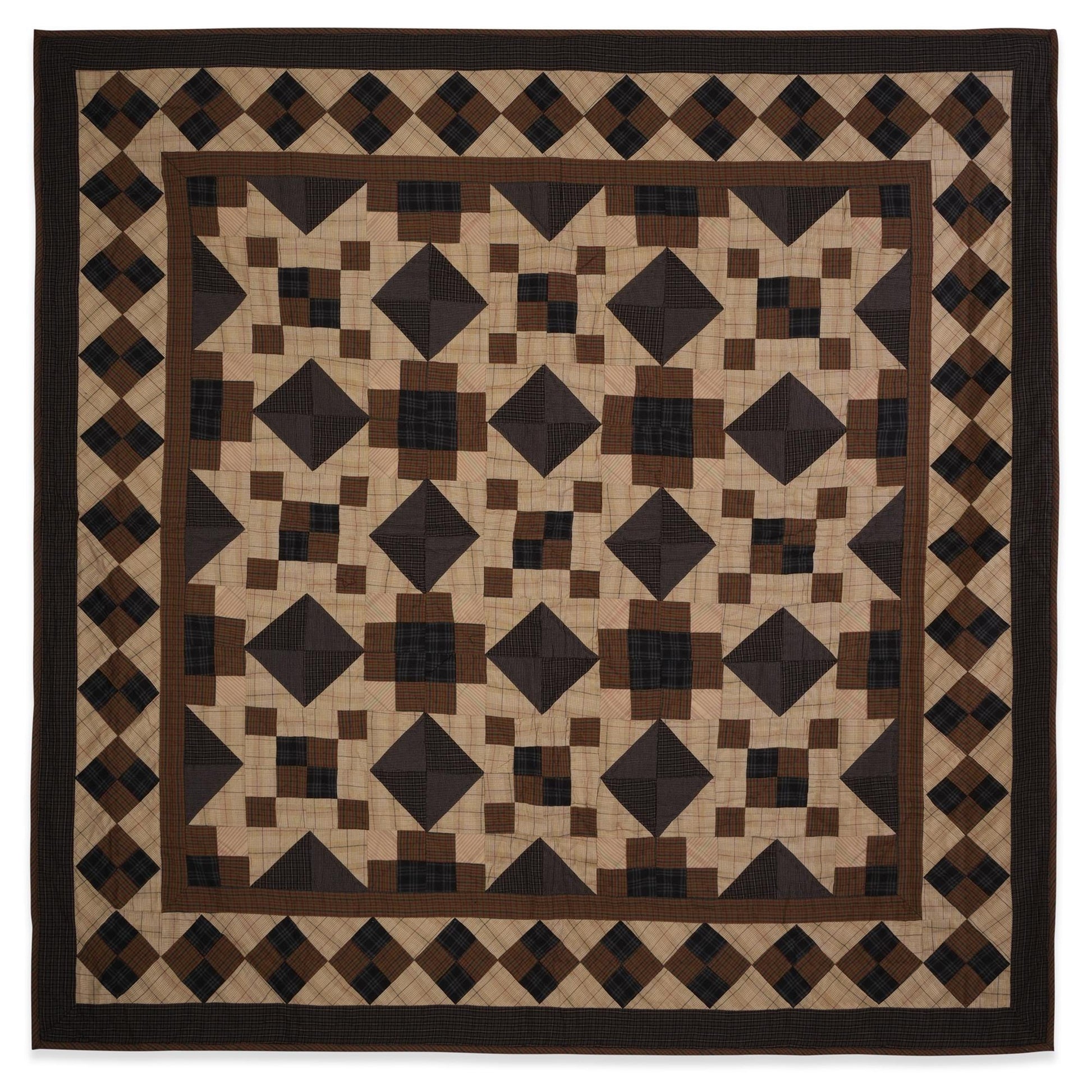 Made of Patchwork in  brown,  beige, black Calico plaid cotton fabric padded with surgical type cotton for a beautiful hand quilting creating a primitive star pattern.