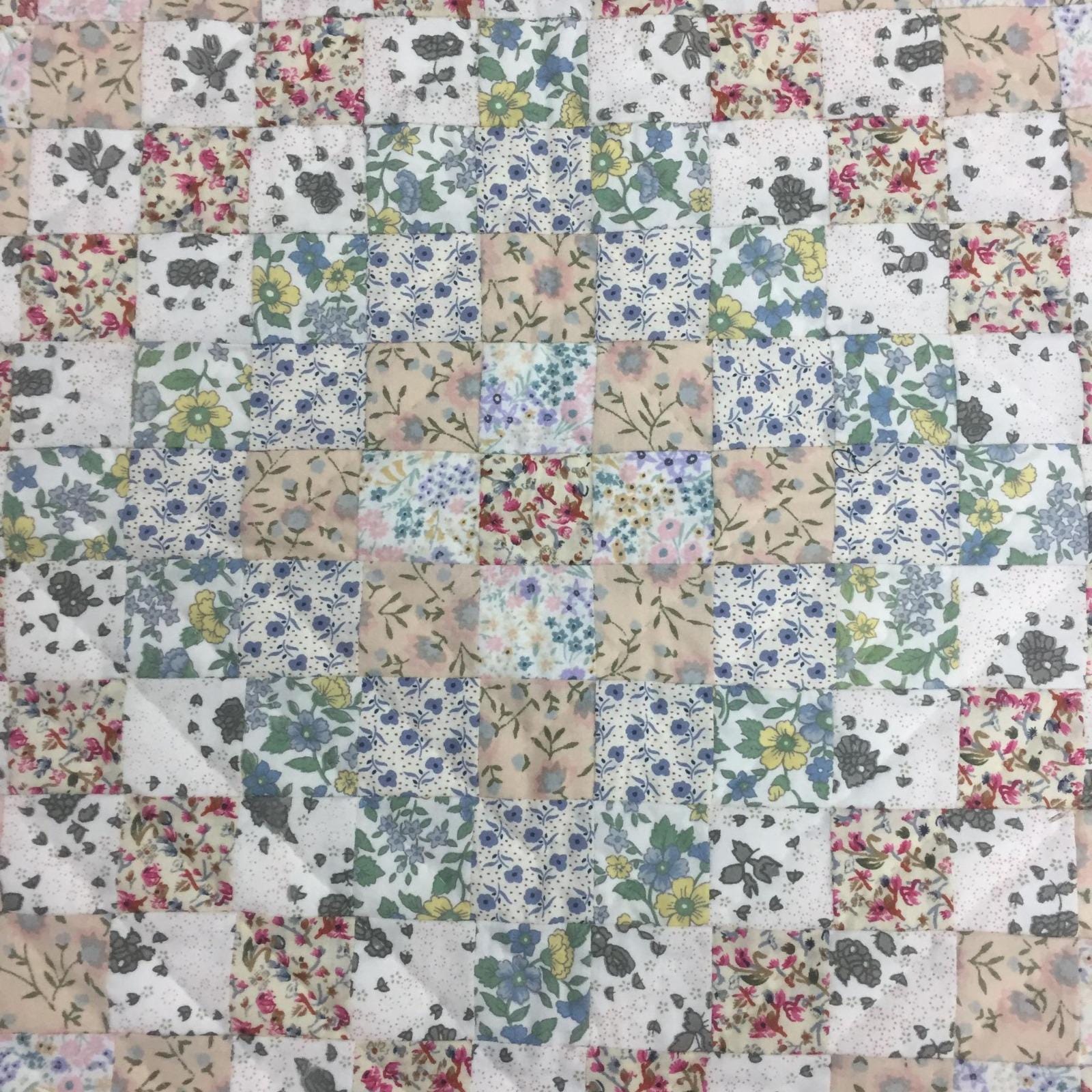 MATERIAL:100% high quality cotton fabric with light color calico floral square cotton creating small square zig zag hand made quilt. Have small patches and pieced together tightly to last after years of use. Padded with cotton layer for extensively quality hand quilting for durability. Reverse side is solid off-white.