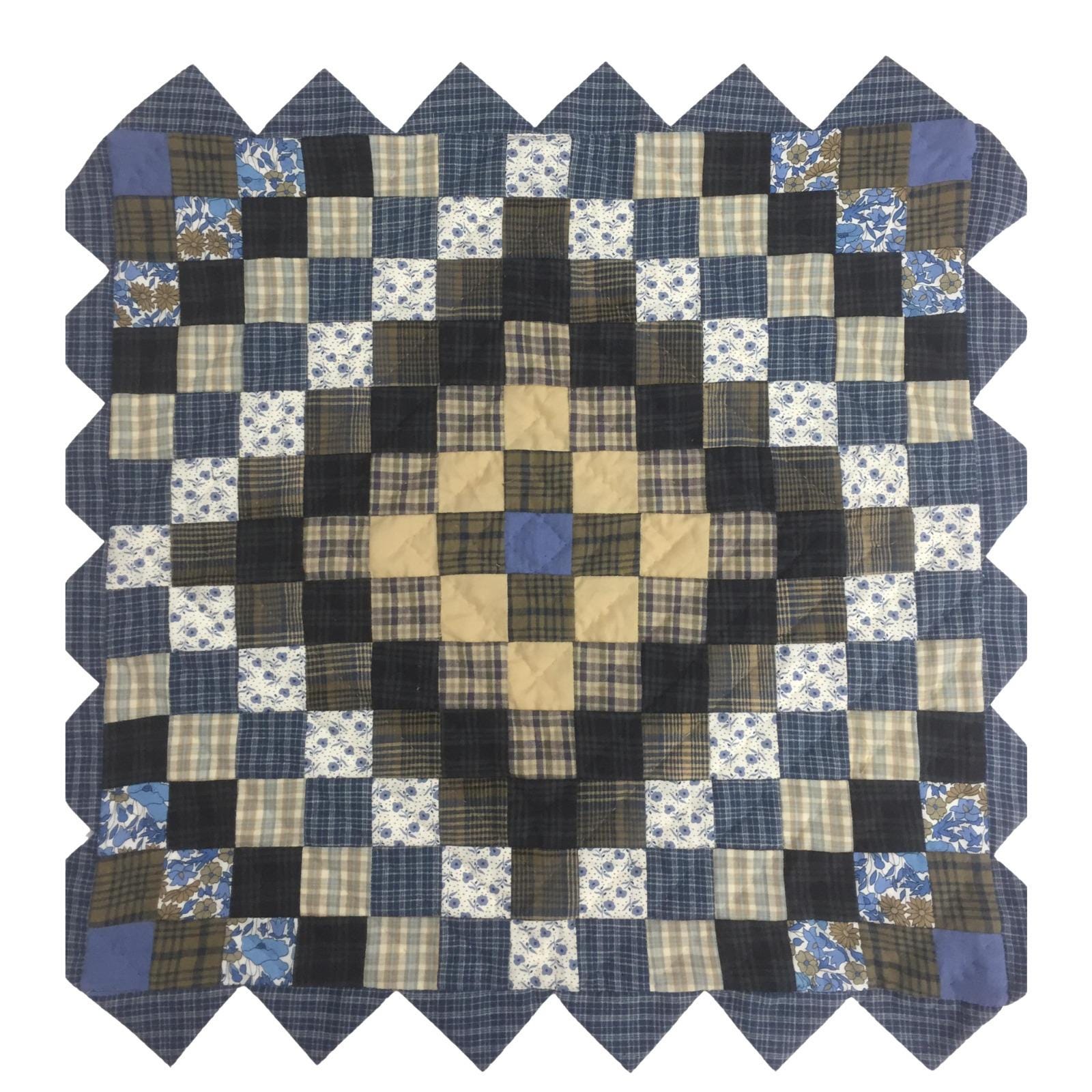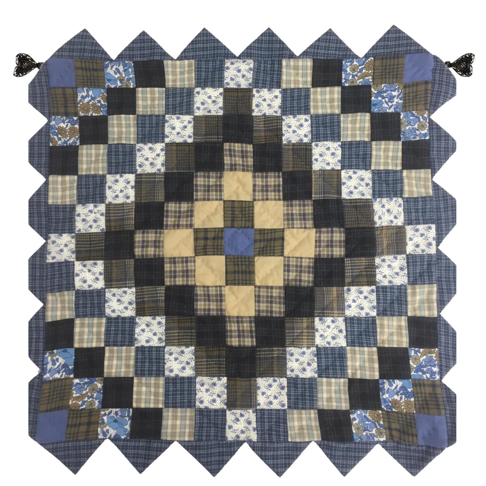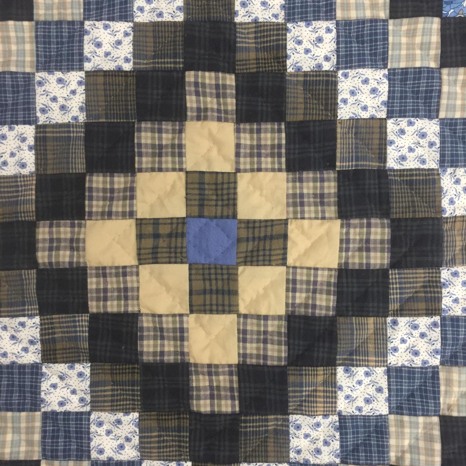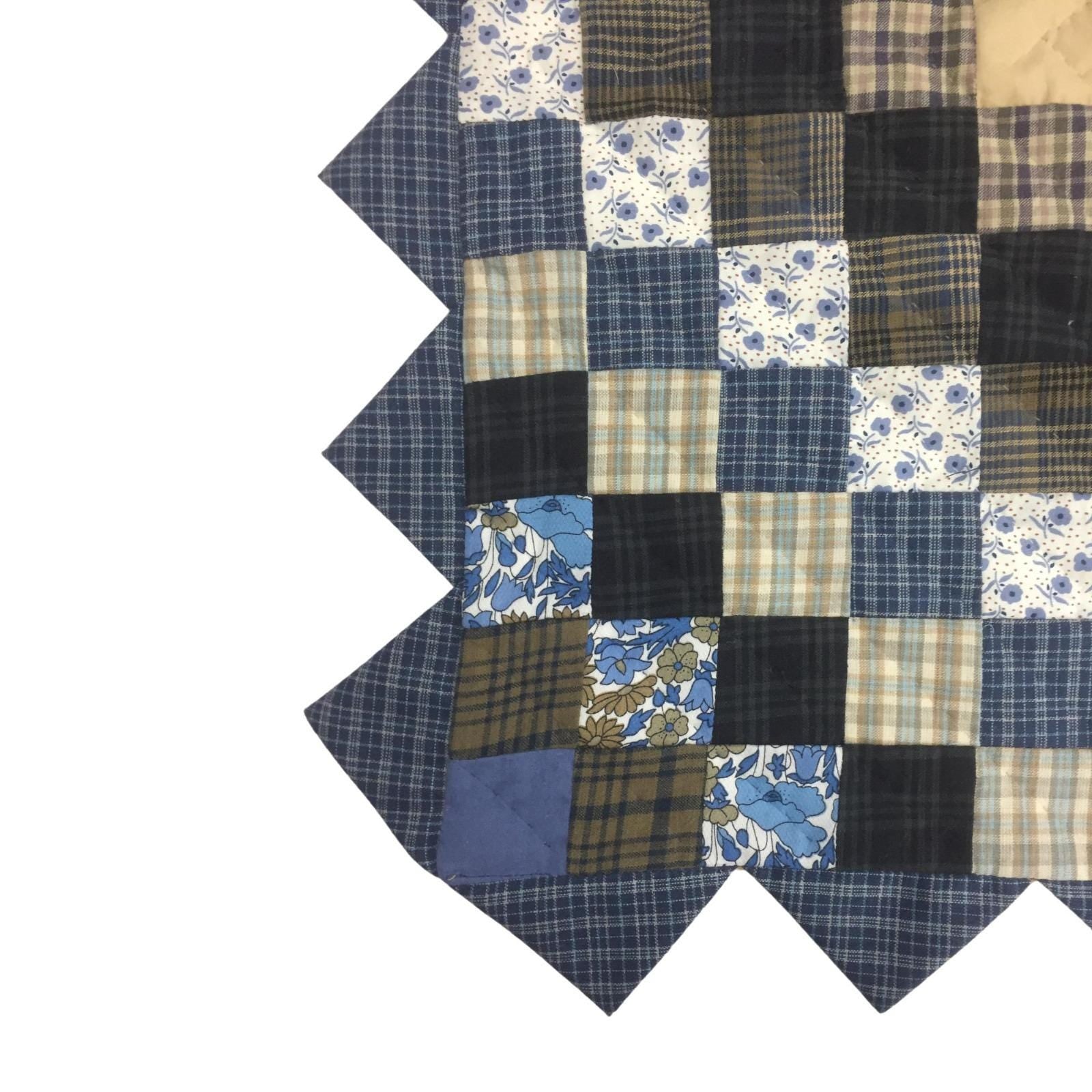 MATERIAL:100% high quality cotton fabric with blue color calico floral & plaid square cotton creating small square zig zag hand made quilt. Have small patches and pieced together tightly to last after years of use. Padded with cotton layer for extensively quality hand quilting for durability. Reverse side is solid khaki.
