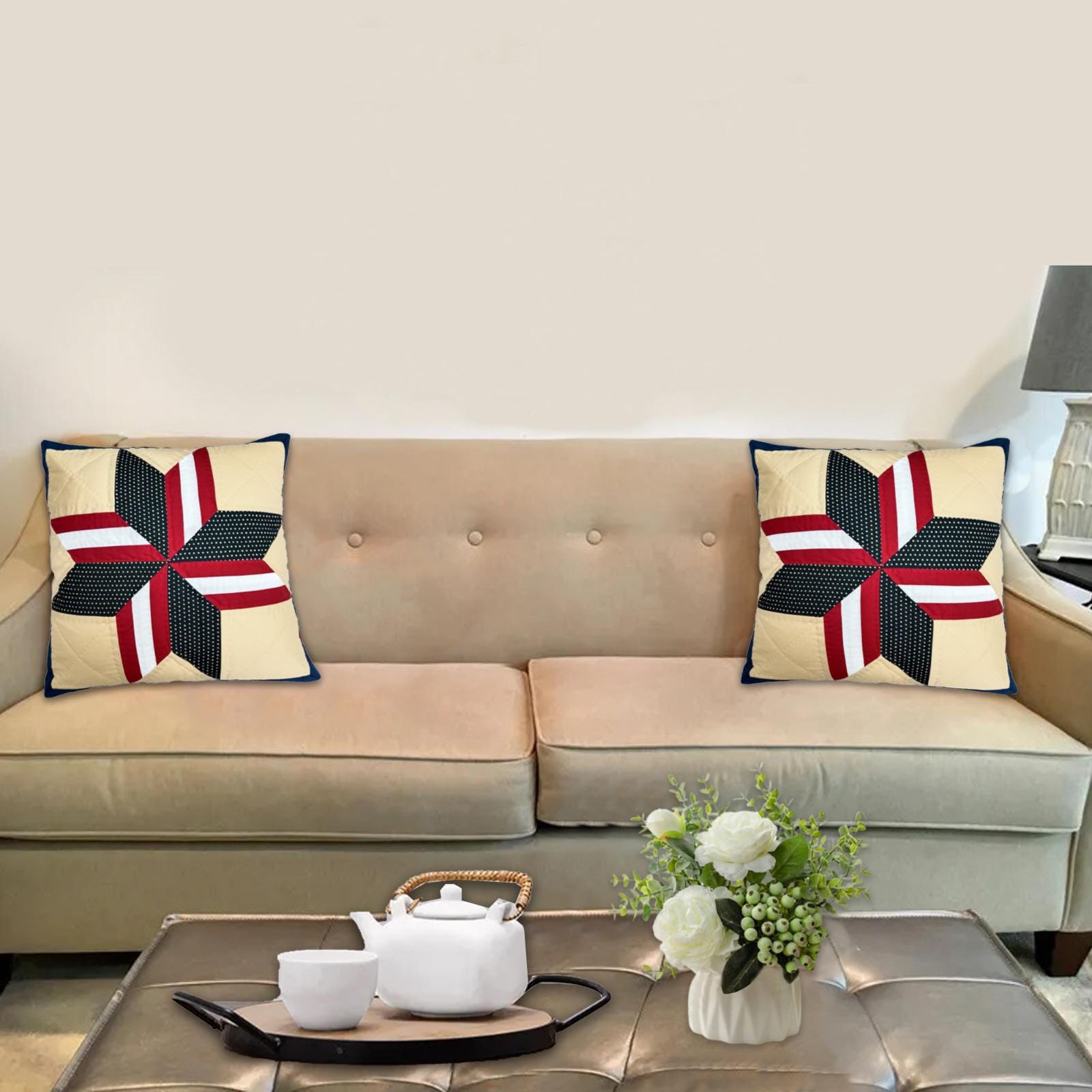 Bring a touch of classic Americana charm into your home with the Americana Starburst pillow cover, lovingly hand quilted by skilled artisans at Home Heart Brands. Featuring a bold starburst design in deep navy, barn red, and crisp white, this patchwork pillow captures the essence of country living and patriotic pride. Each piece is carefully crafted with attention to detail and heirloom-quality stitching—perfect for farmhouse décor, festive celebrations, or everyday comfort.