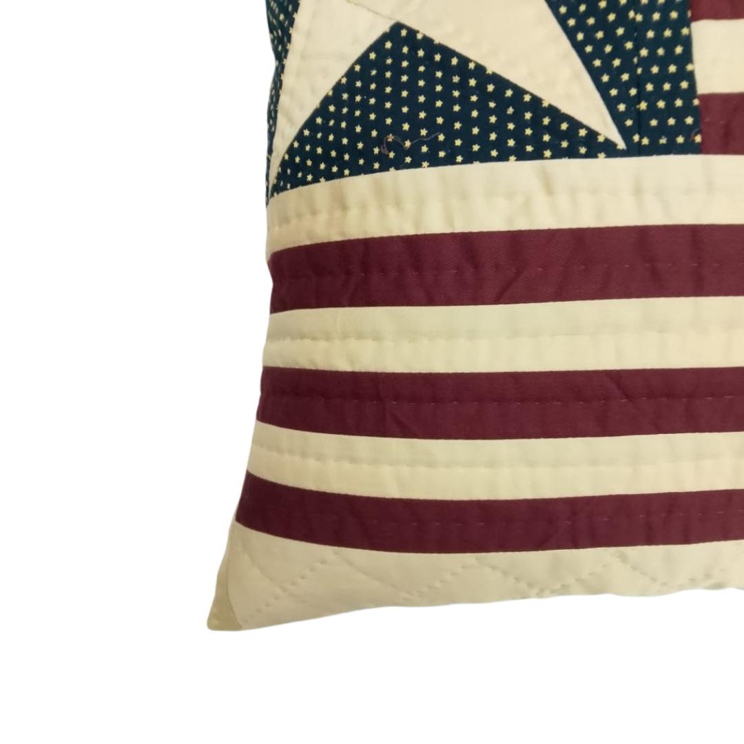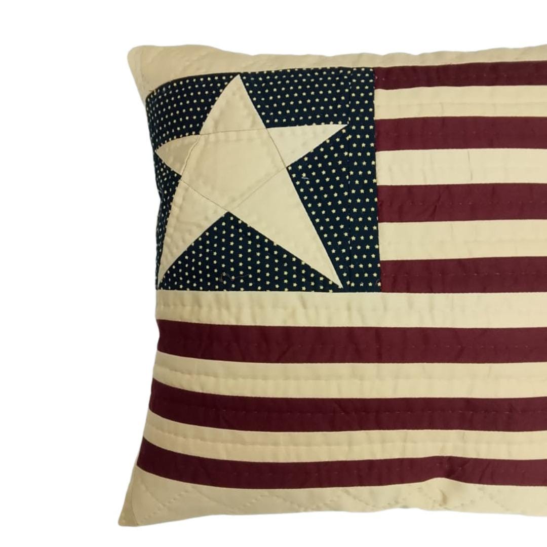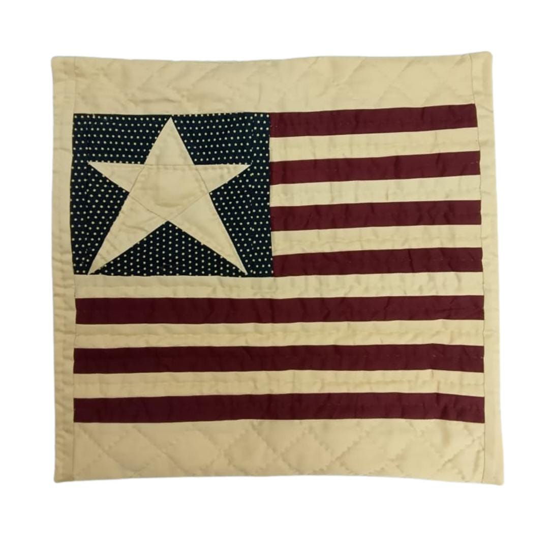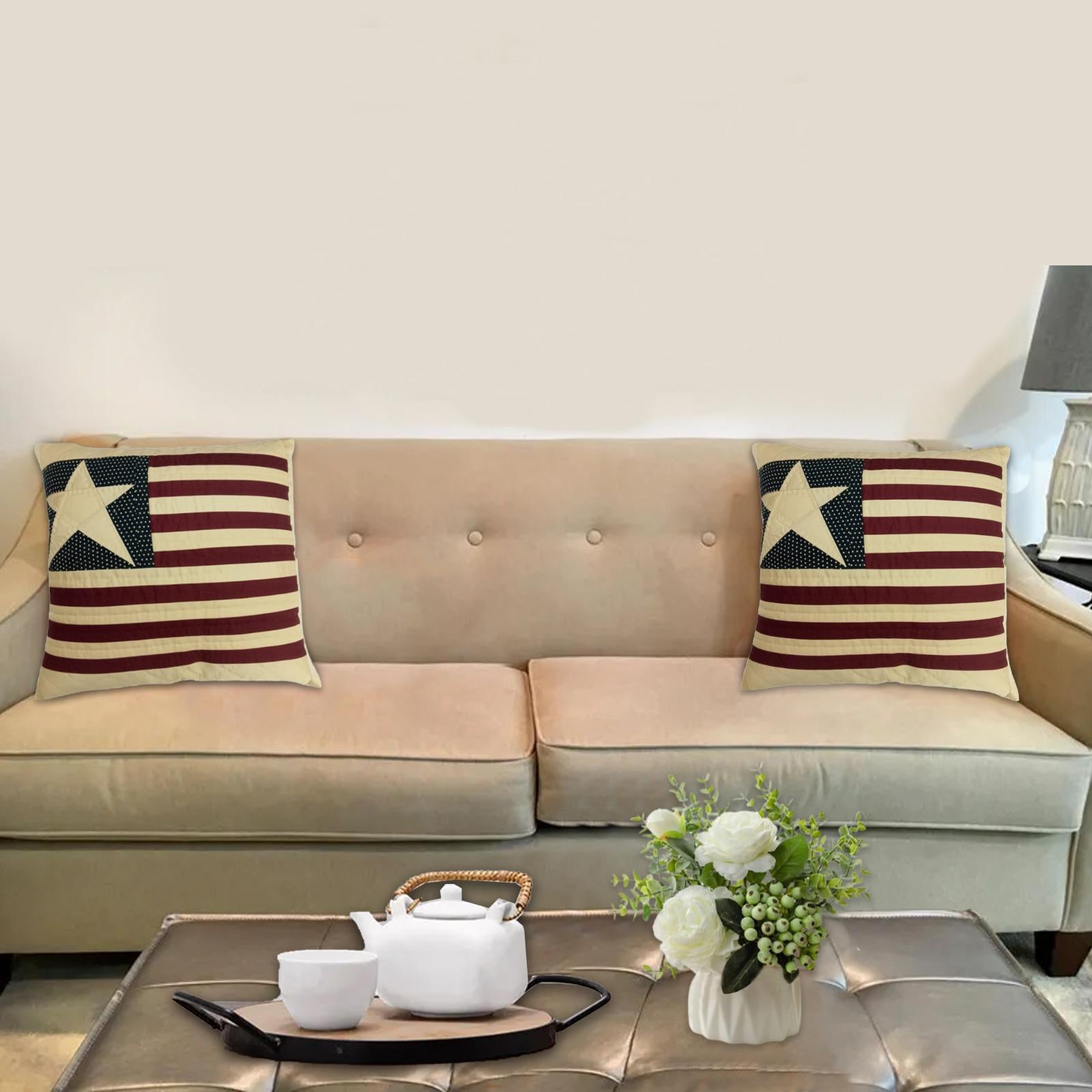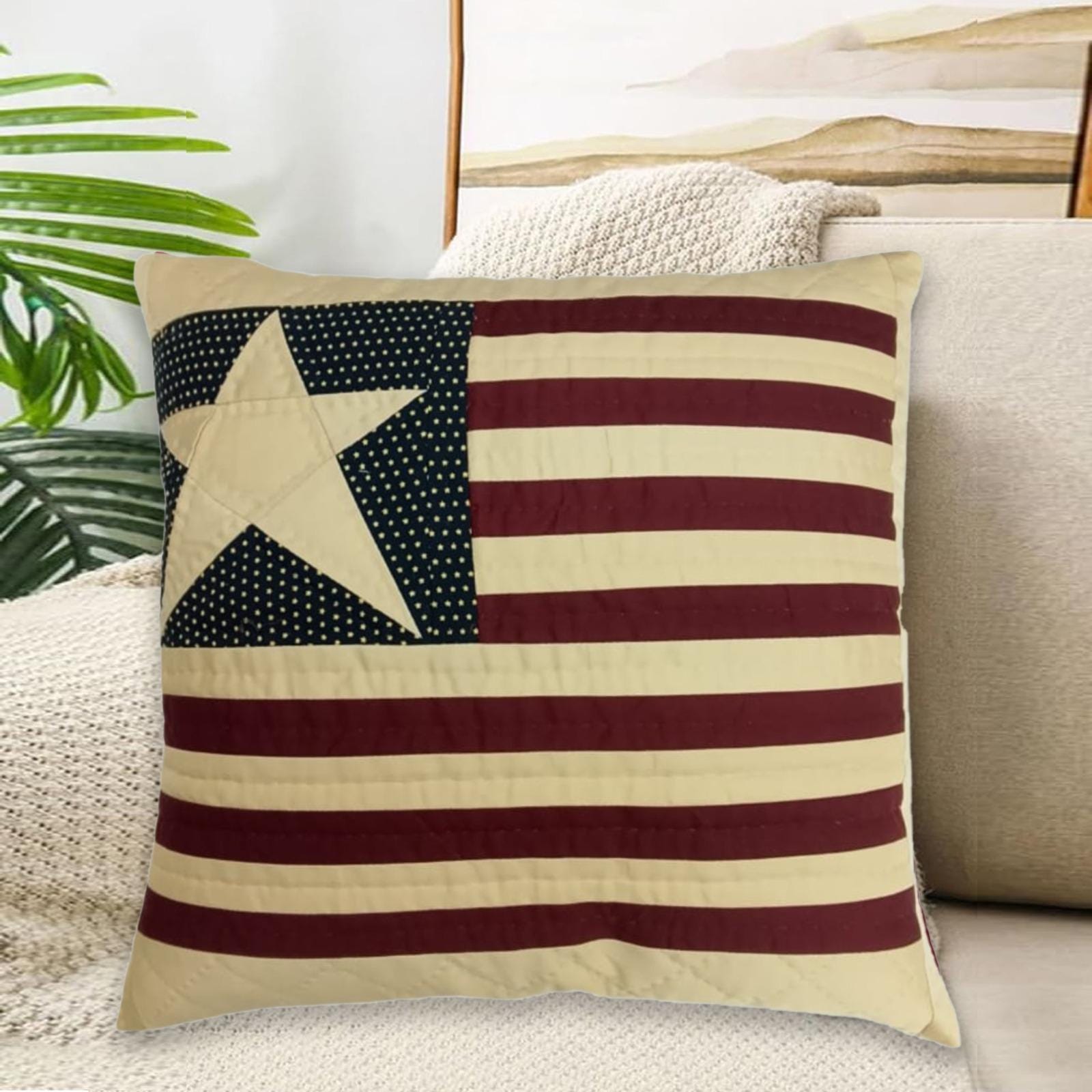 Celebrate the spirit of country living with our Rustic Americana Pillow, a charming addition to your farmhouse or patriotic decor. This handcrafted cushion showcases a stylized American flag with deep burgundy stripes, a star appliqué on navy with petite gold dots, and a soft beige background designed to mimic the warmth of tea-dyed fabric — without the actual dyeing process.