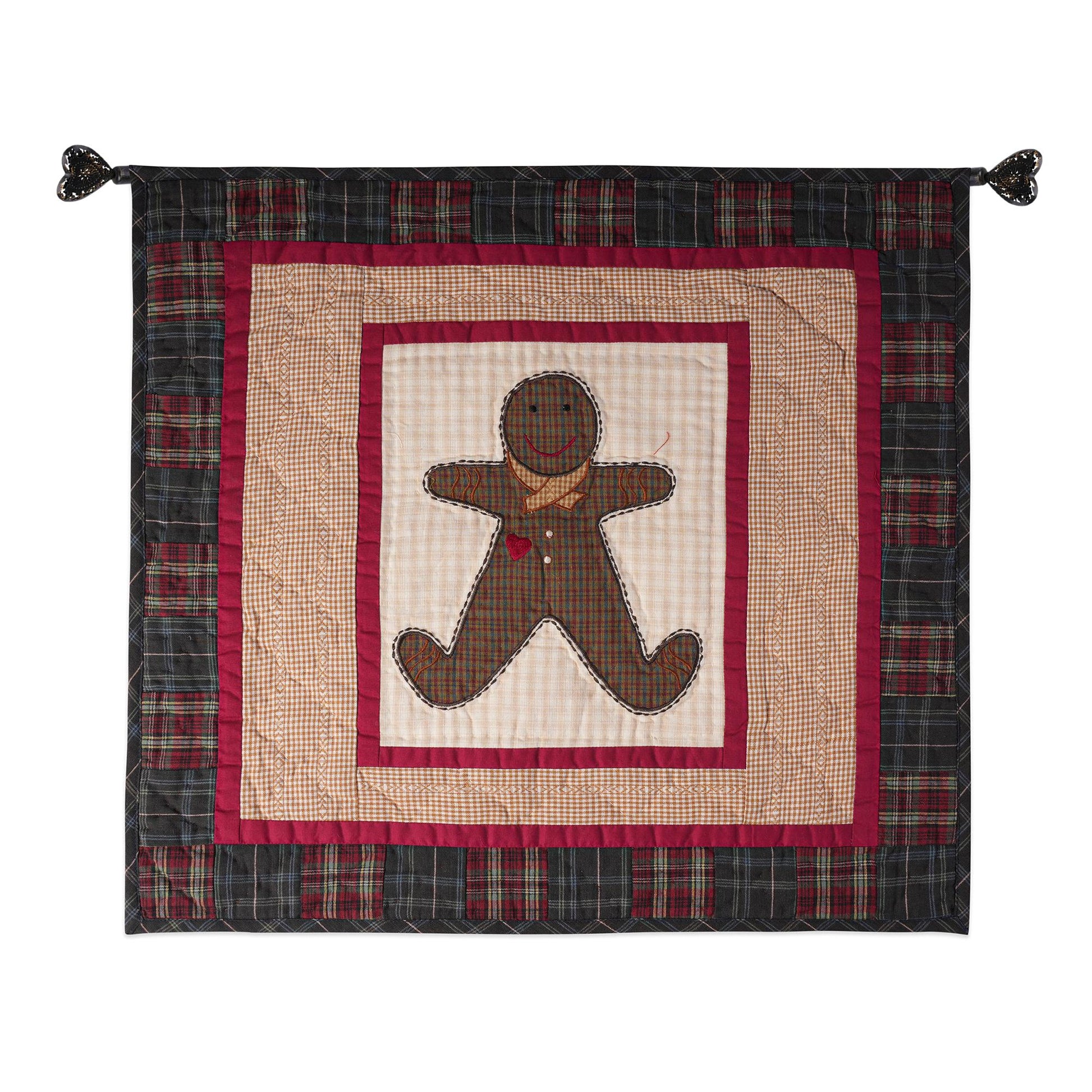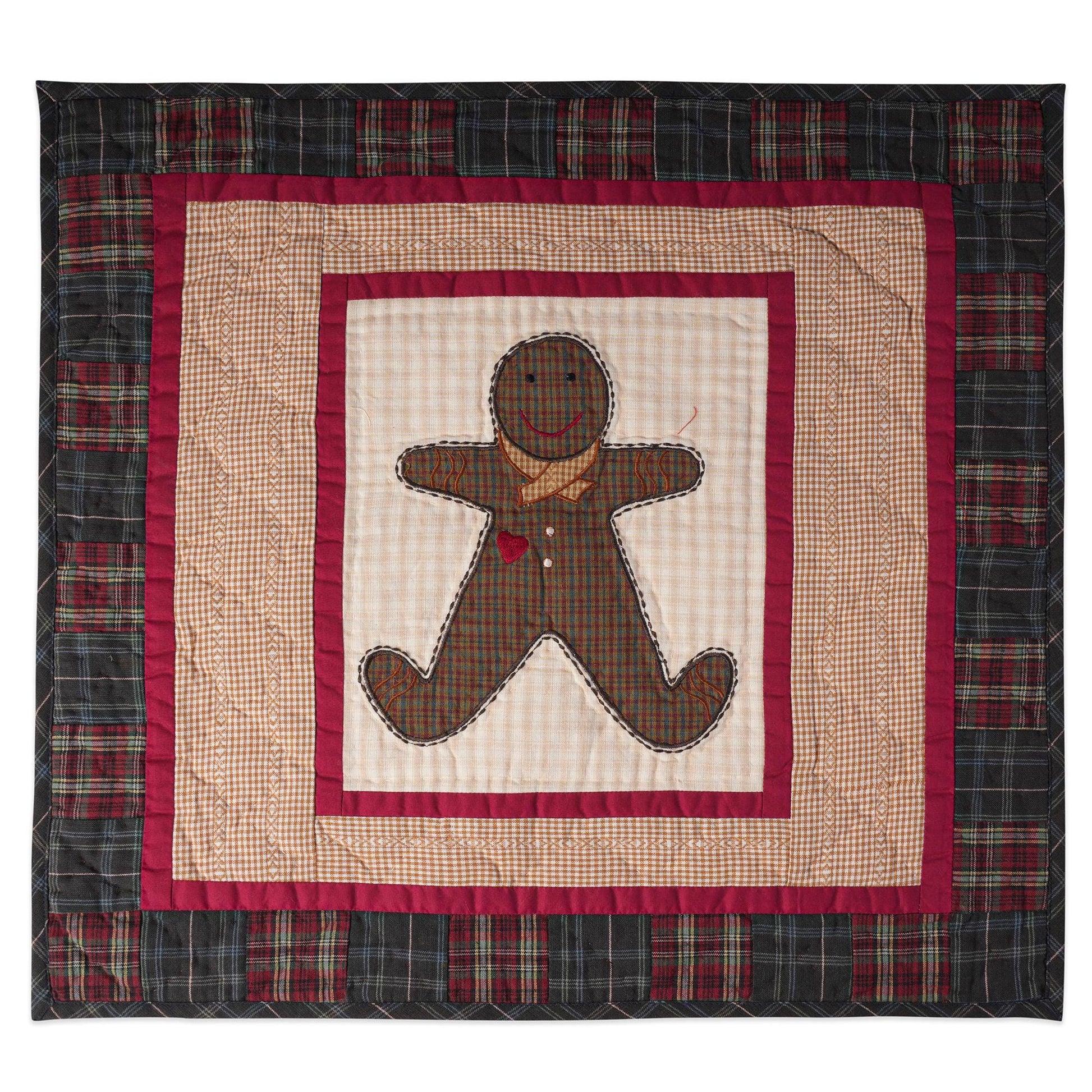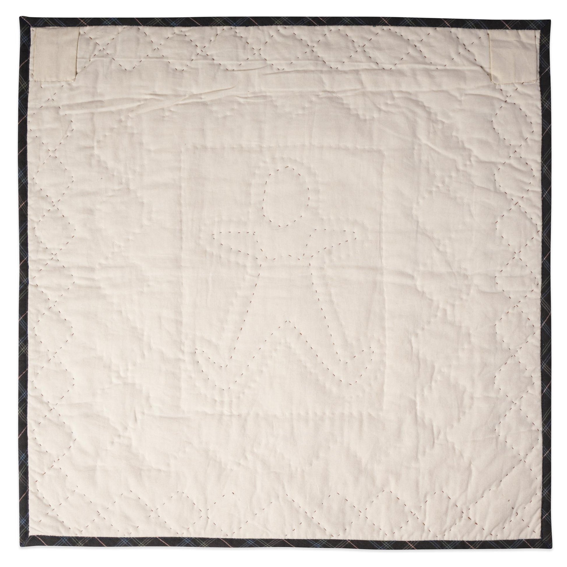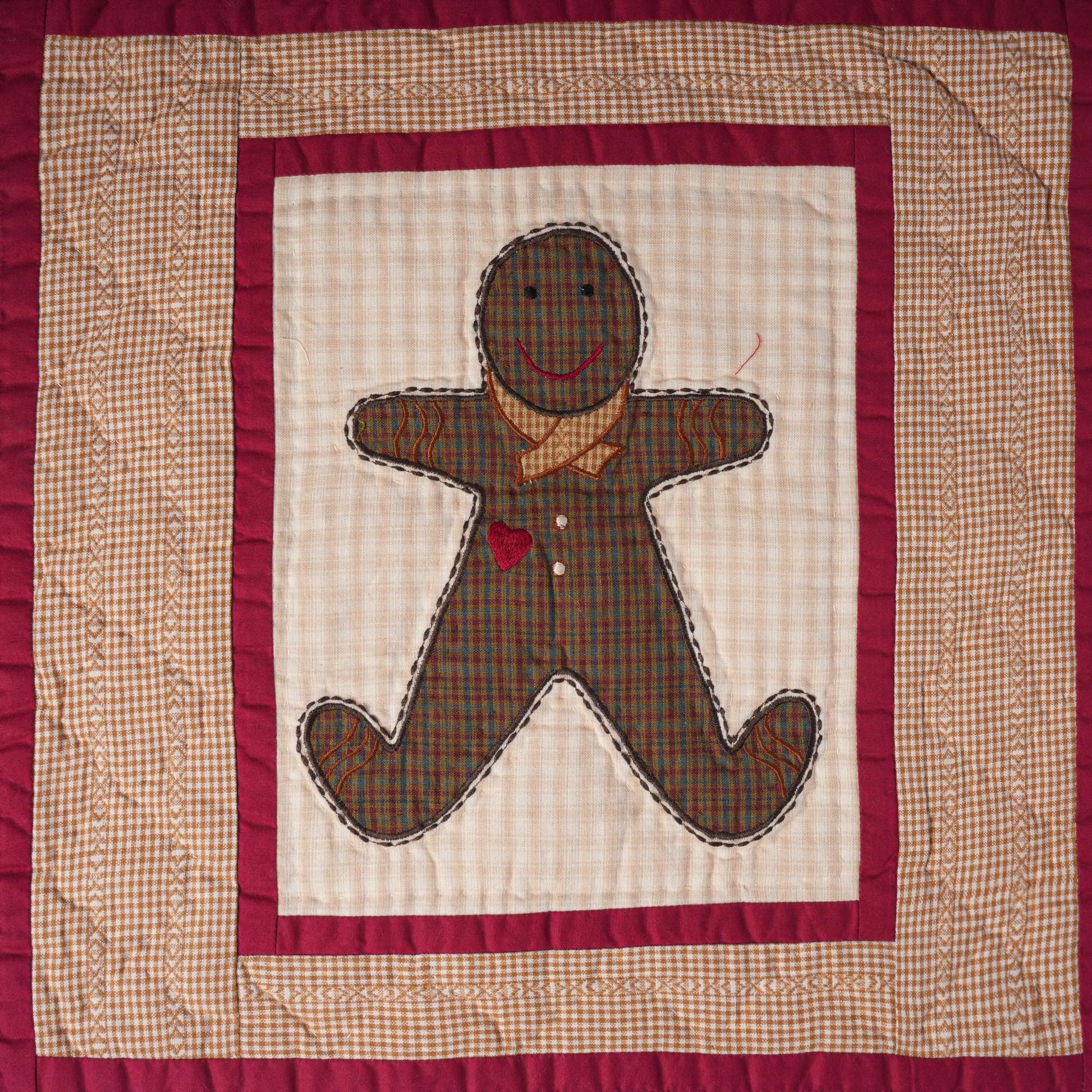 MATERIAL:100% high quality cotton fabric with beige, brown, bugundy & black plaid cotton creating ginger man embroidered hand made quilt. Have small patches and pieced together tightly to last after years of use. Padded with cotton layer for extensively quality hand quilting for durability. Reverse side is solid offwhite.