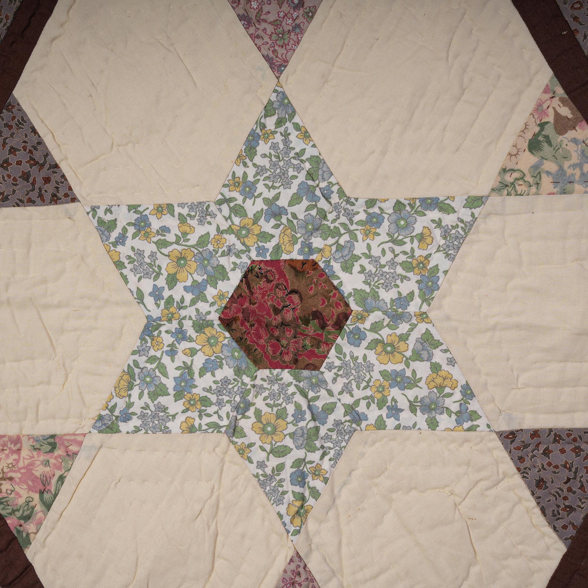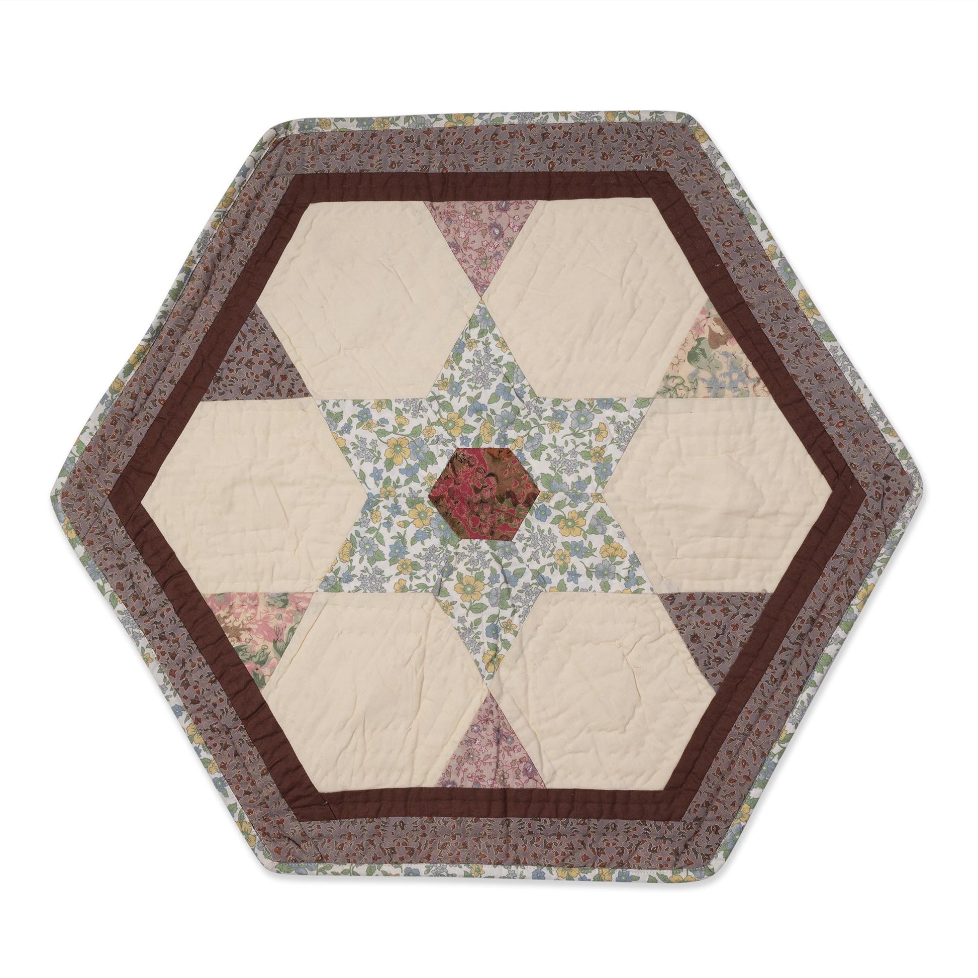 MATERIAL:100% high quality cotton fabric with offwhite & multi floral cotton creating hexagon star hand made quilt. Have small patches and pieced together tightly to last after years of use. Padded with cotton layer for extensively quality hand quilting for durability. Reverse side is solid offwhite.