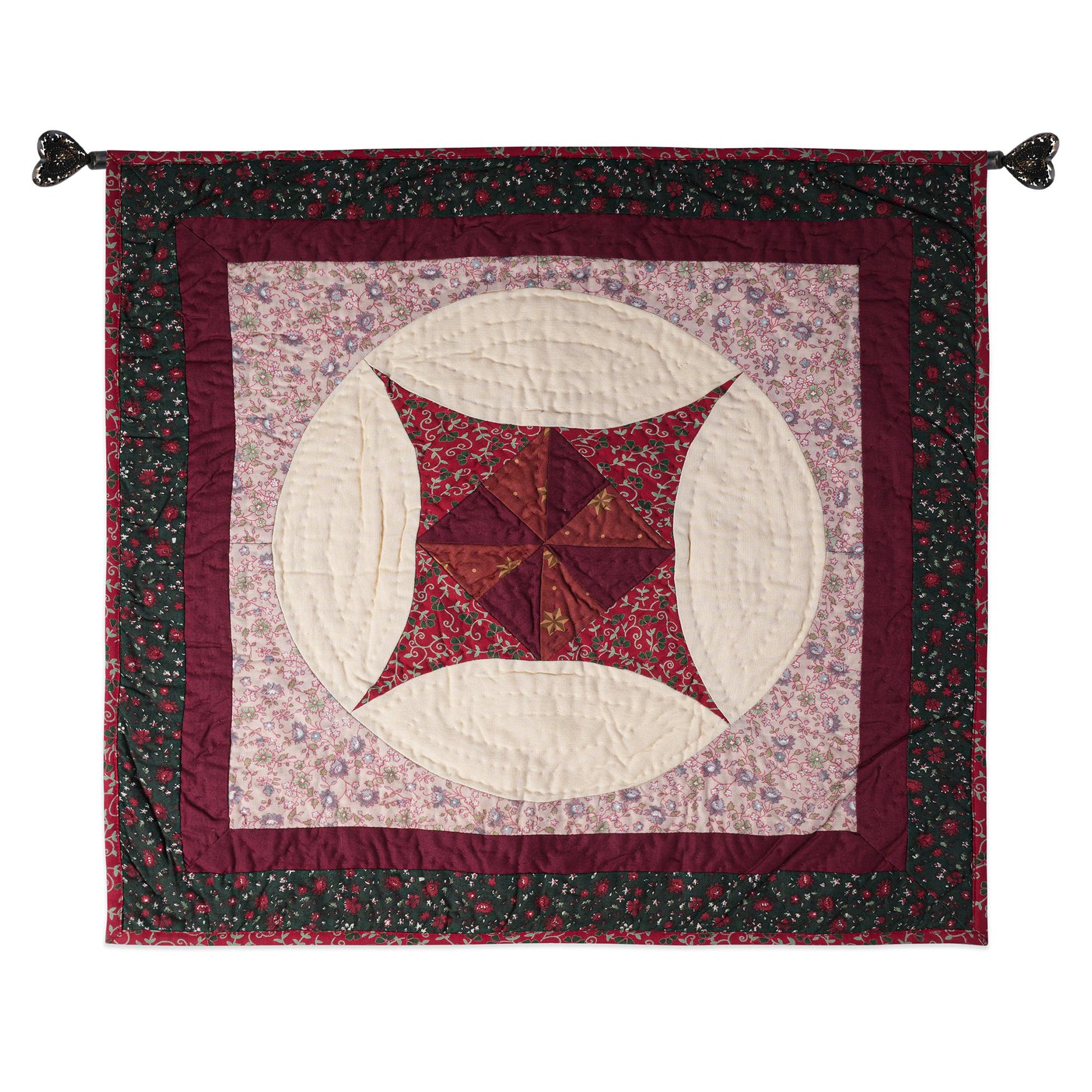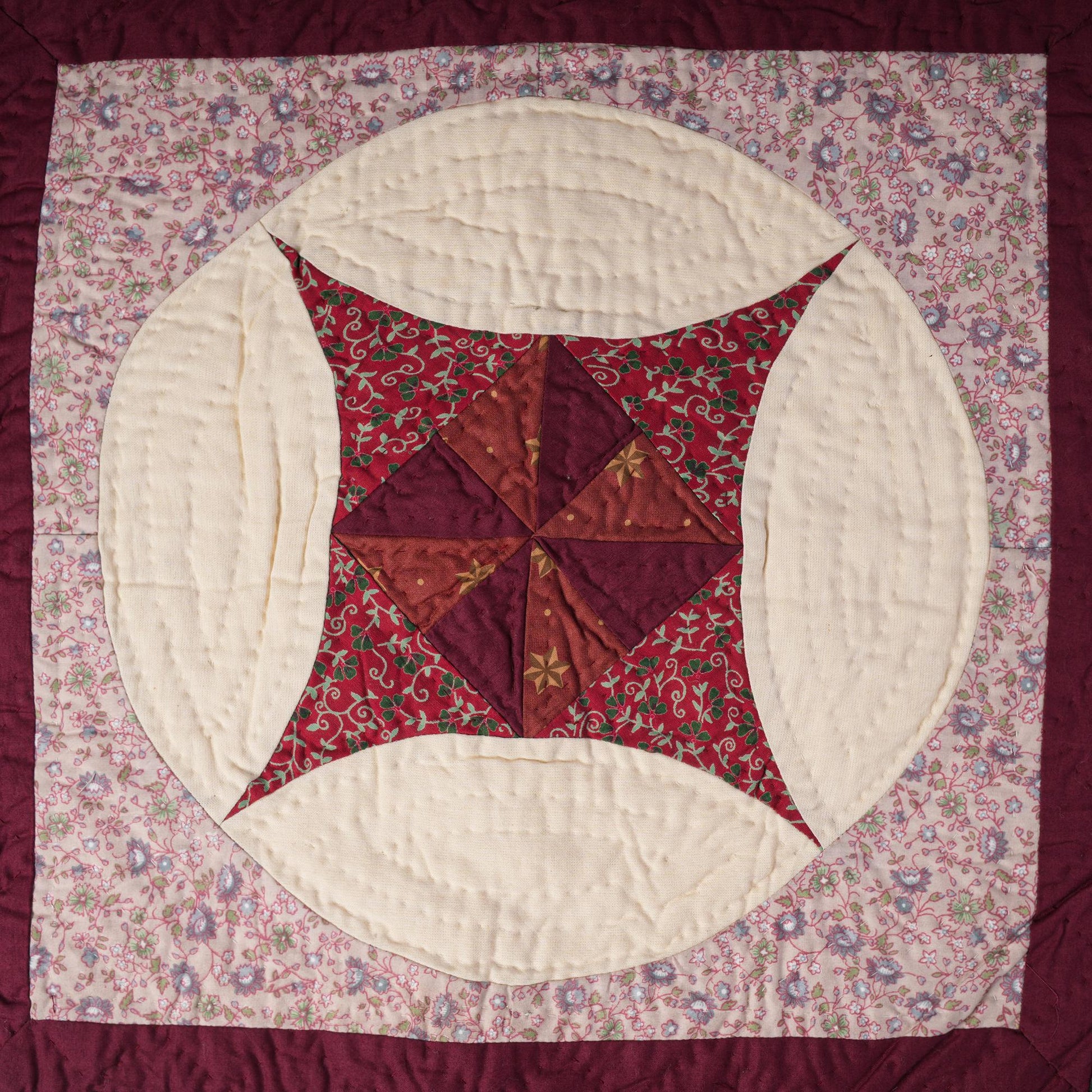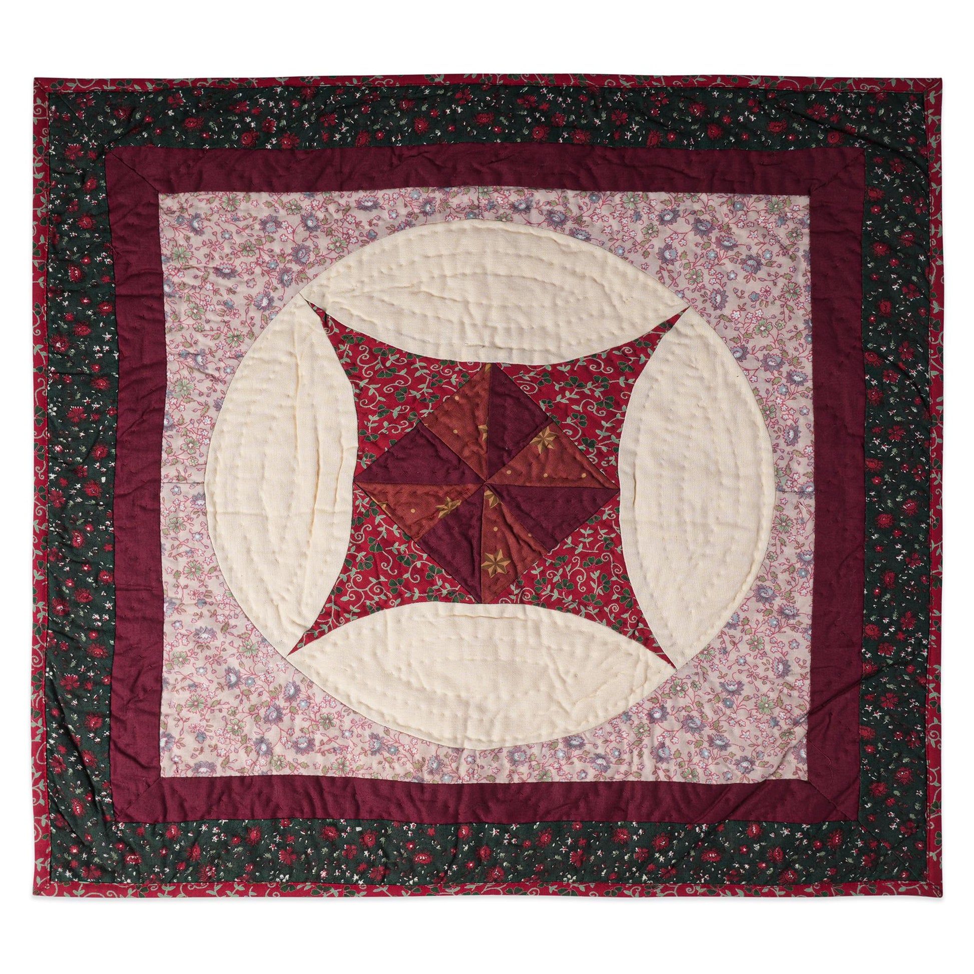 MATERIAL:100% high quality cotton fabric with red, green calico cotton creating pinwheel hand made quilt. Have small patches and pieced together tightly to last after years of use. Padded with cotton layer for extensively quality hand quilting for durability. Reverse side is solid offwhite.