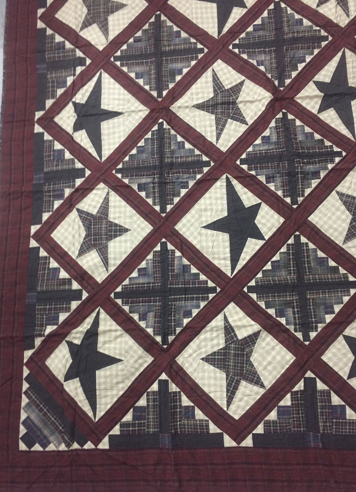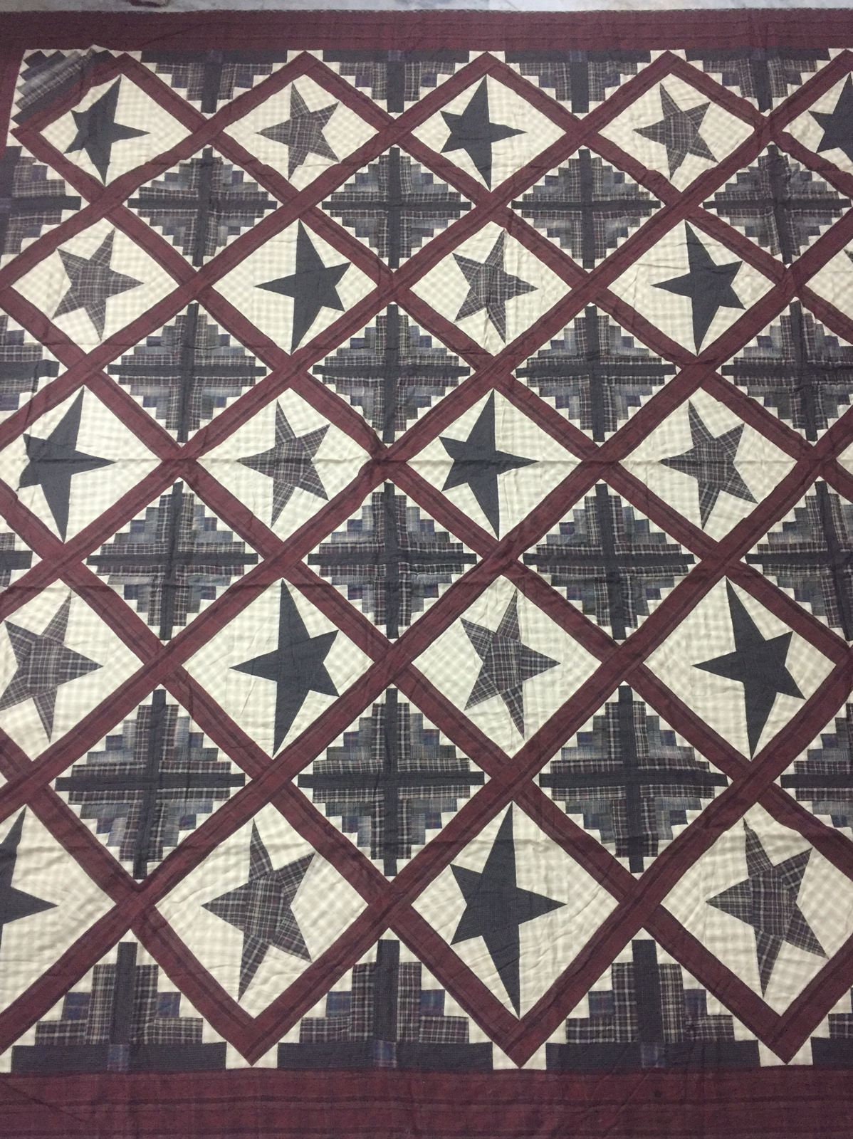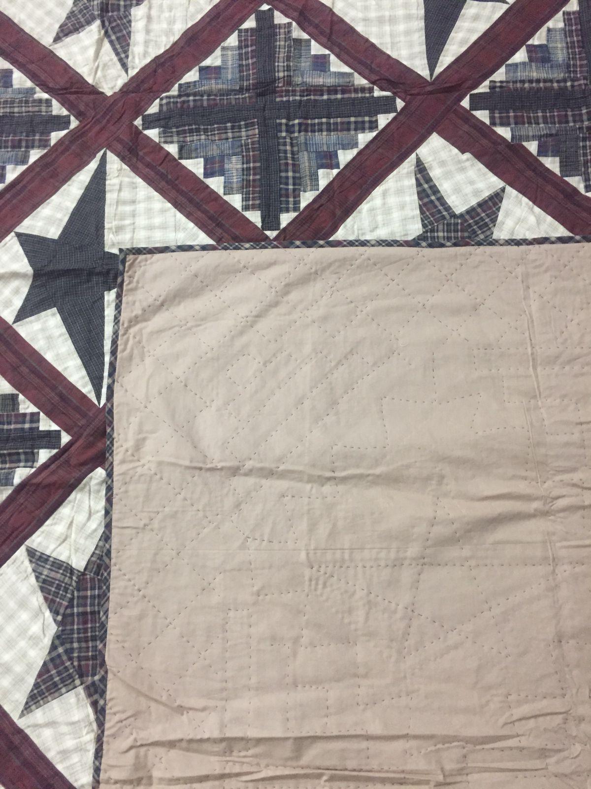 COUNTRY PATCHWORK DESIGN: Traditional style that compliments any country, rustic, or Americana home. Cabin star features multi color plaid cotton fabric with Burgundy, Slate and Black tones and beige plaid fabric creating a Log Cabin design. It has boarder of burgundy fabric. The quilt reverses to Khaki solid high quality cotton fabric.