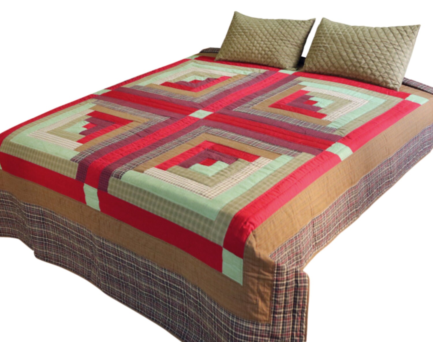 COUNTRY PATCHWORK DESIGN: Traditional style that compliments any country, rustic, or Americana home.Log cabin features assorted patchwork blocks in red, green, tan, brown, and maize in a traditional log cabin patchwork layout design. The quilt reverses to Khaki solid high quality cotton fabric.