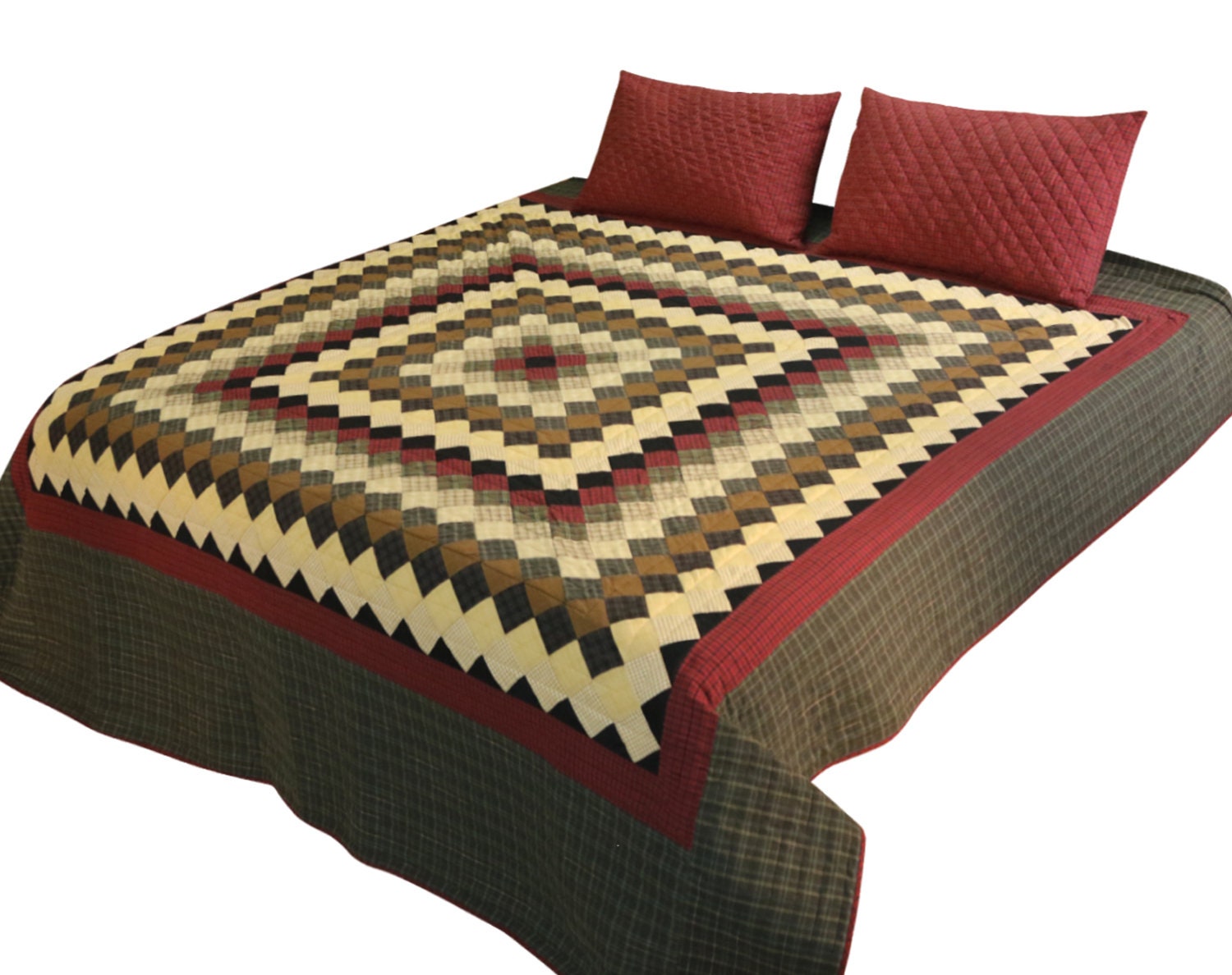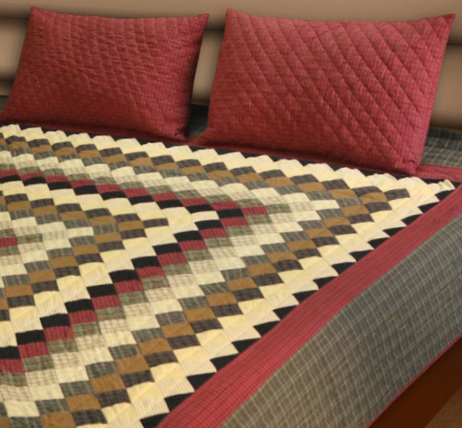 COUNTRY PATCHWORK DESIGN: Traditional style that compliments any country, rustic, or Americana home. Quilted Square features intricate tiny square patchwork style in red, black, tan, brown, and maize in a traditional simple 2x2 inch square patchwork layout design. The quilt reverses to Khaki solid high quality cotton fabric.