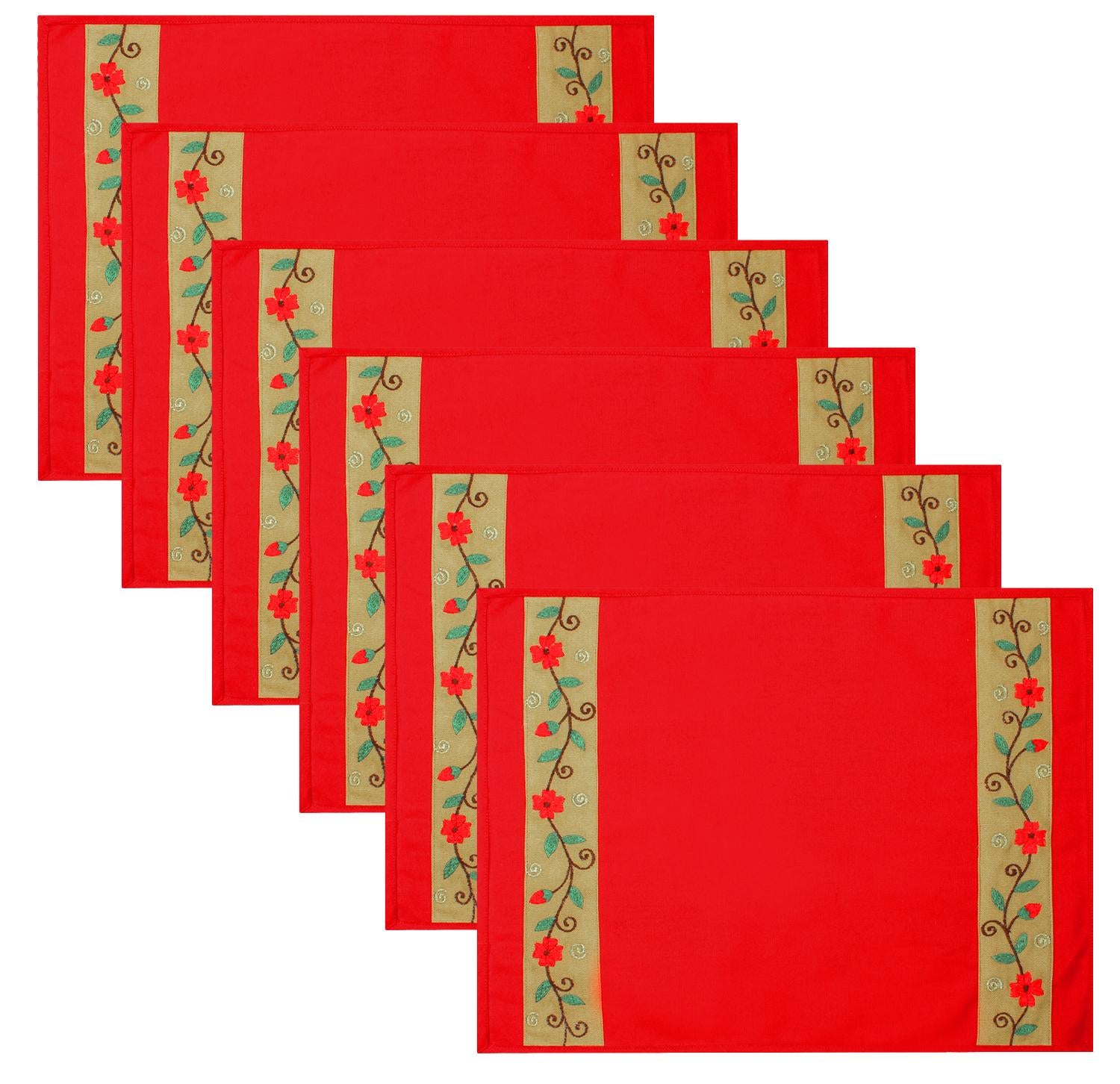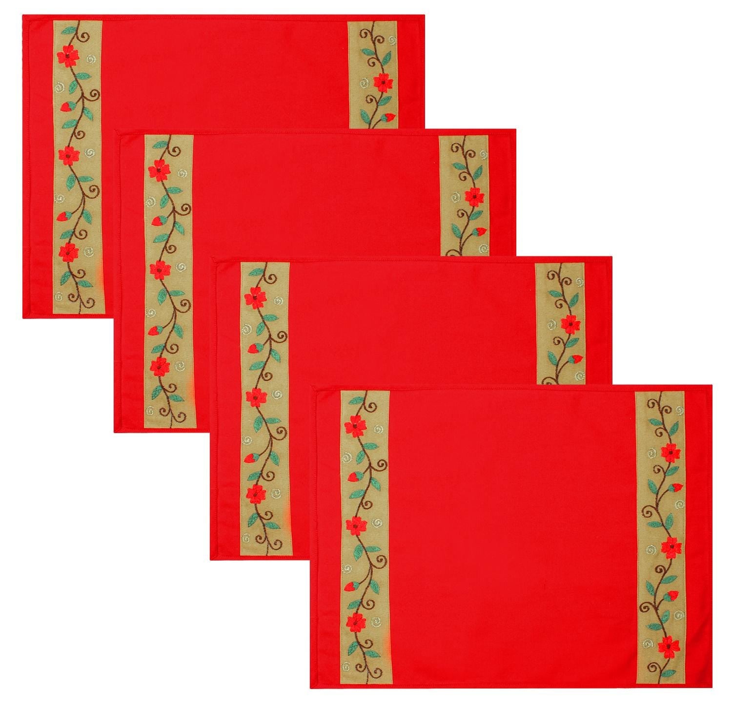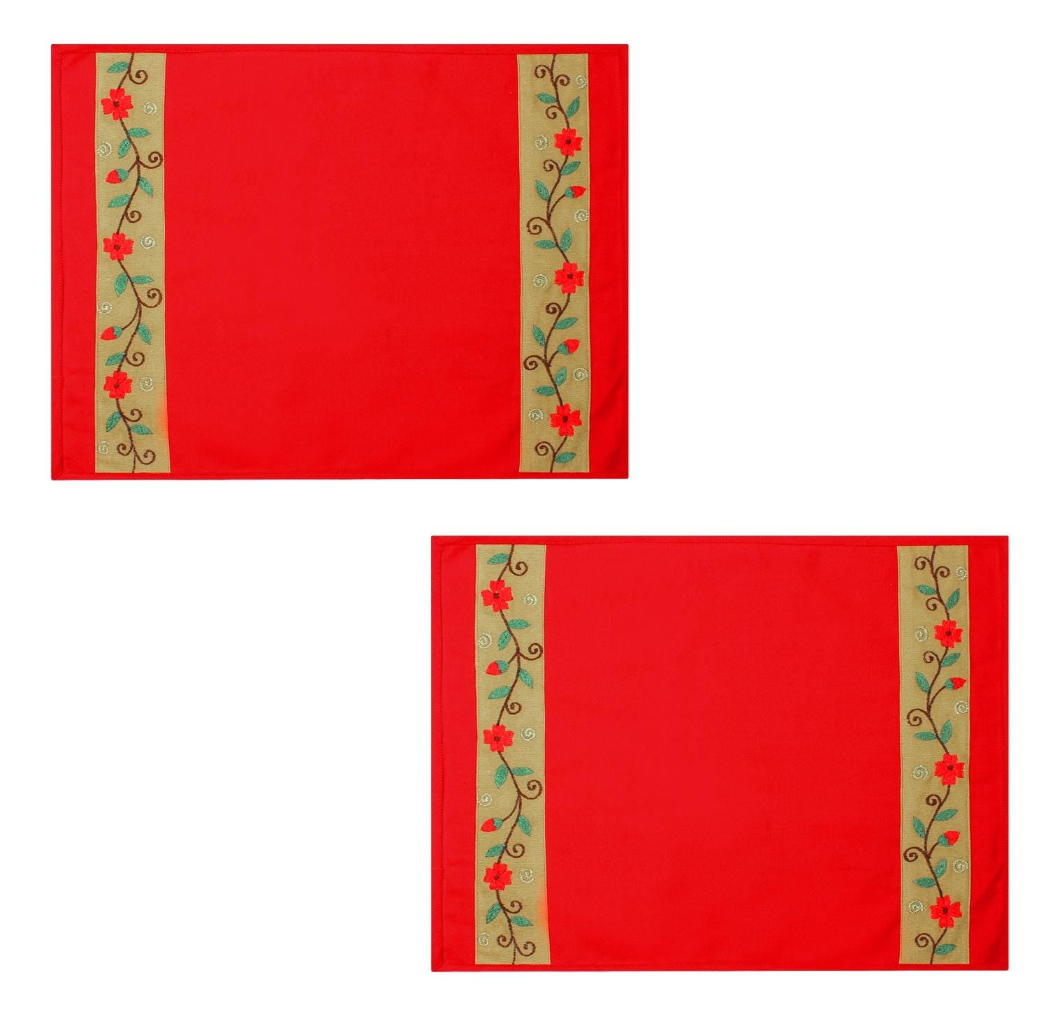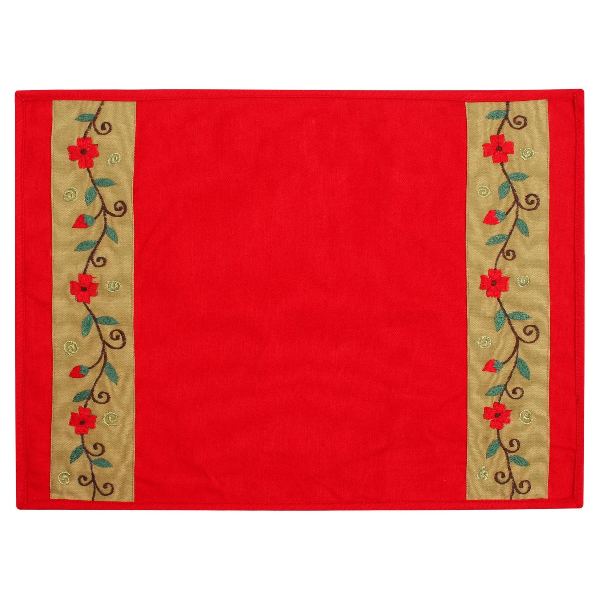 Placemat & Toppers Premium tapestry red duck cotton fabric floral embroidered on beige applique border by Home Heart Brands(Made in India)