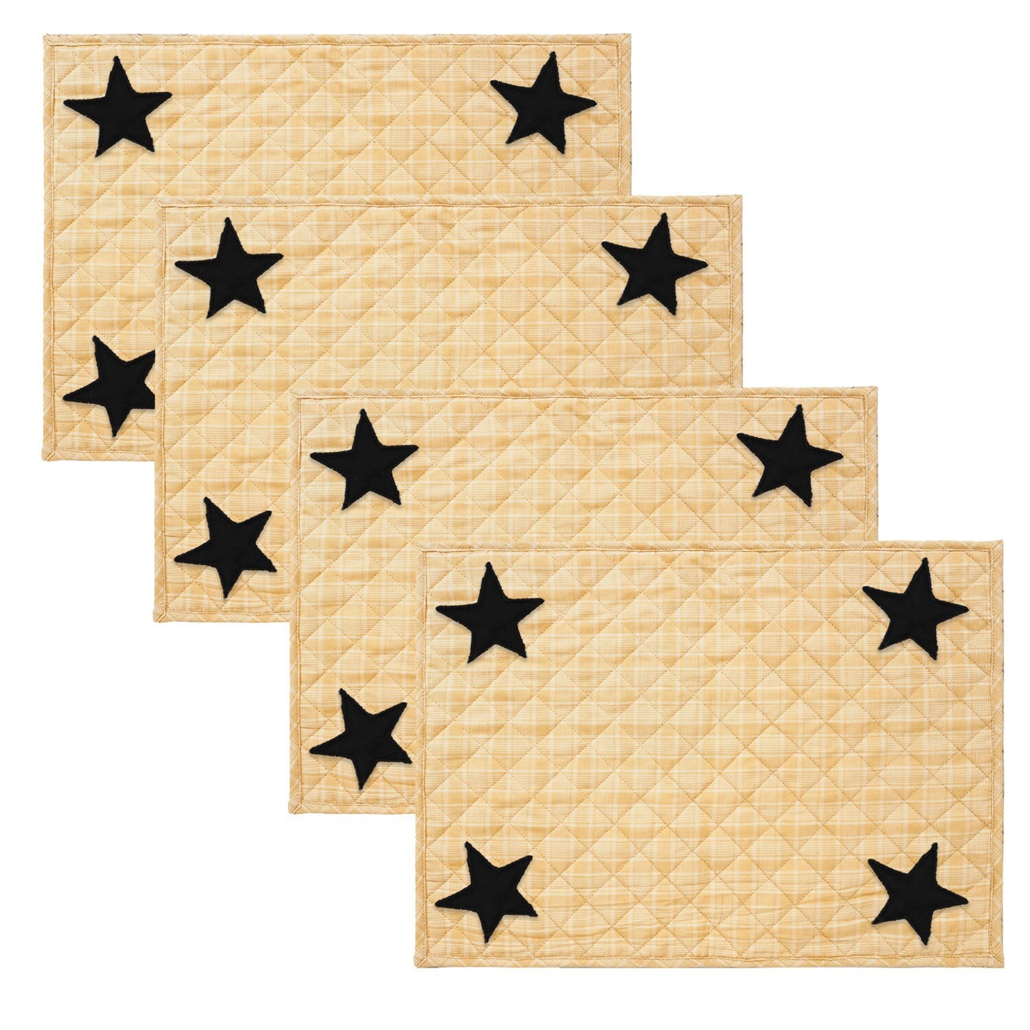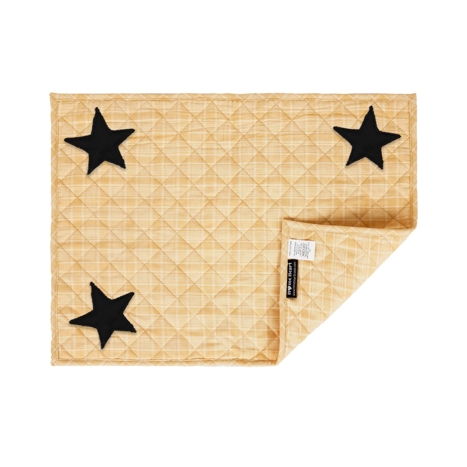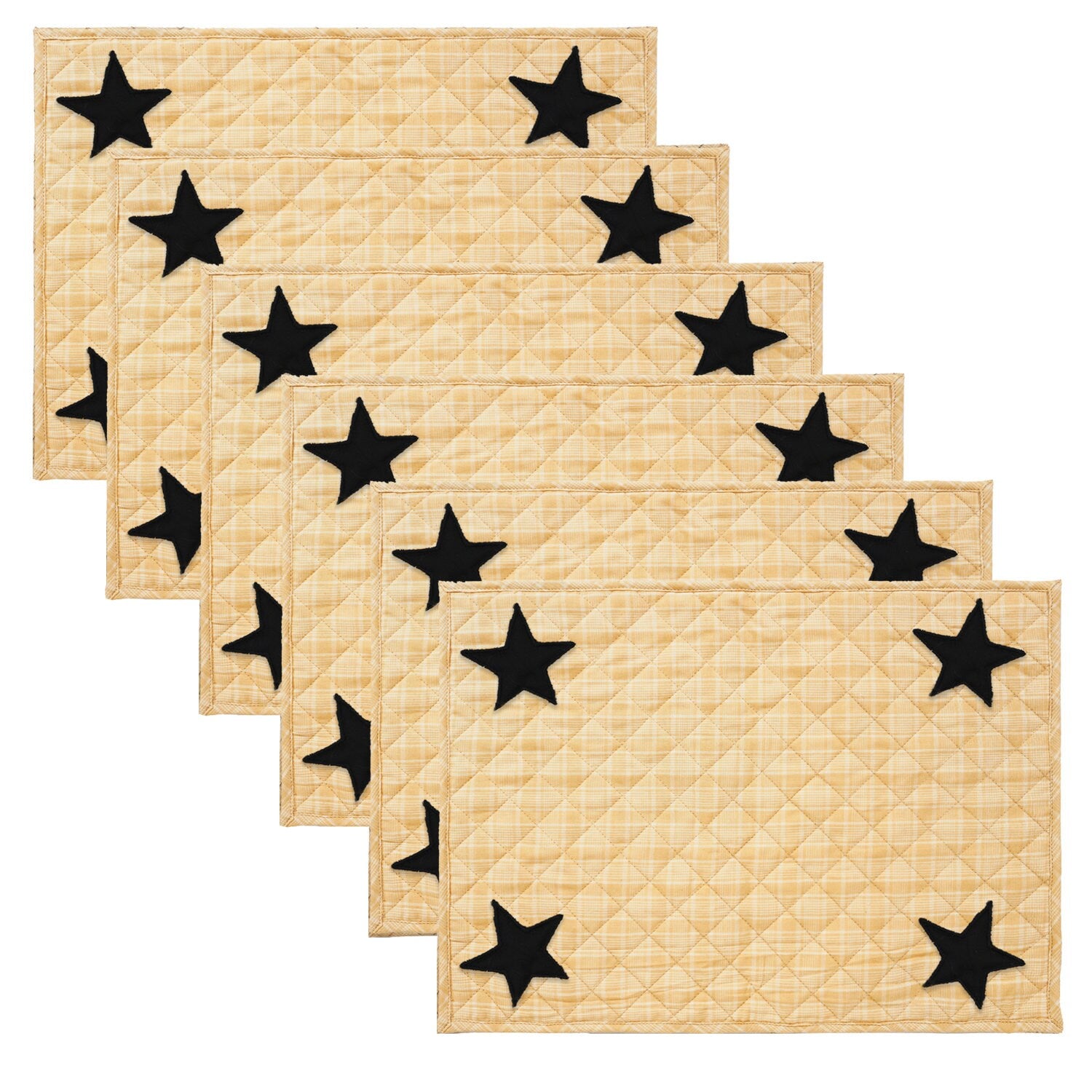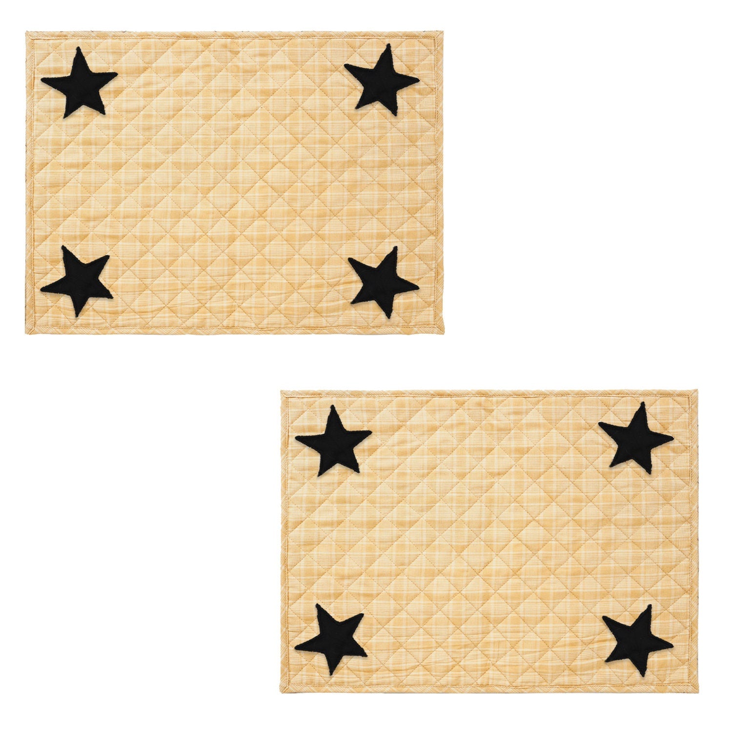 MATERIAL:100% high quality cotton fabric with appliqued black stars. Padded with cotton layer for extensively quality quilting for durability. Reverse side is matching gold plaid fabric . View the entire Black star design.