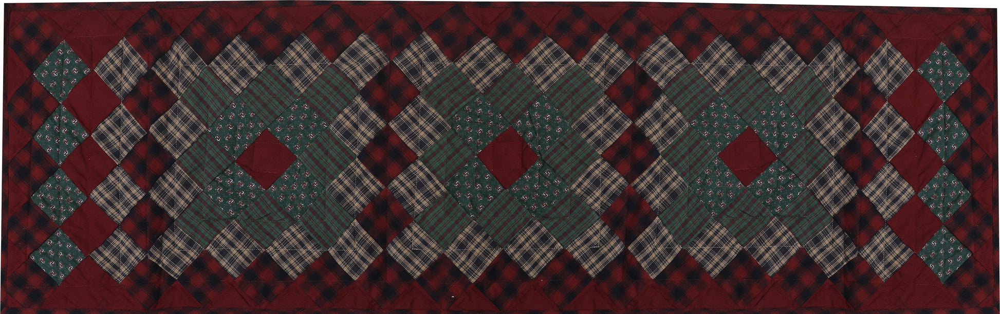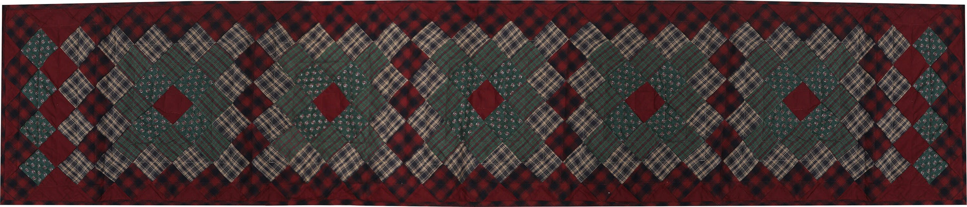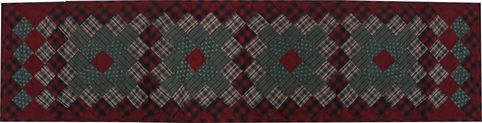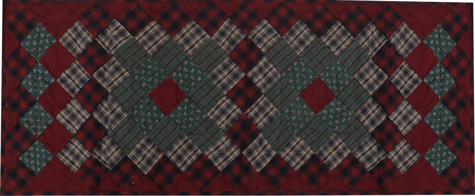 Winter berry  features a rustic mix of burgundy, green and black fabrics. Floral, check, plaid and solid combine to form an eye-catching runner than can be used on the table or as a decor.