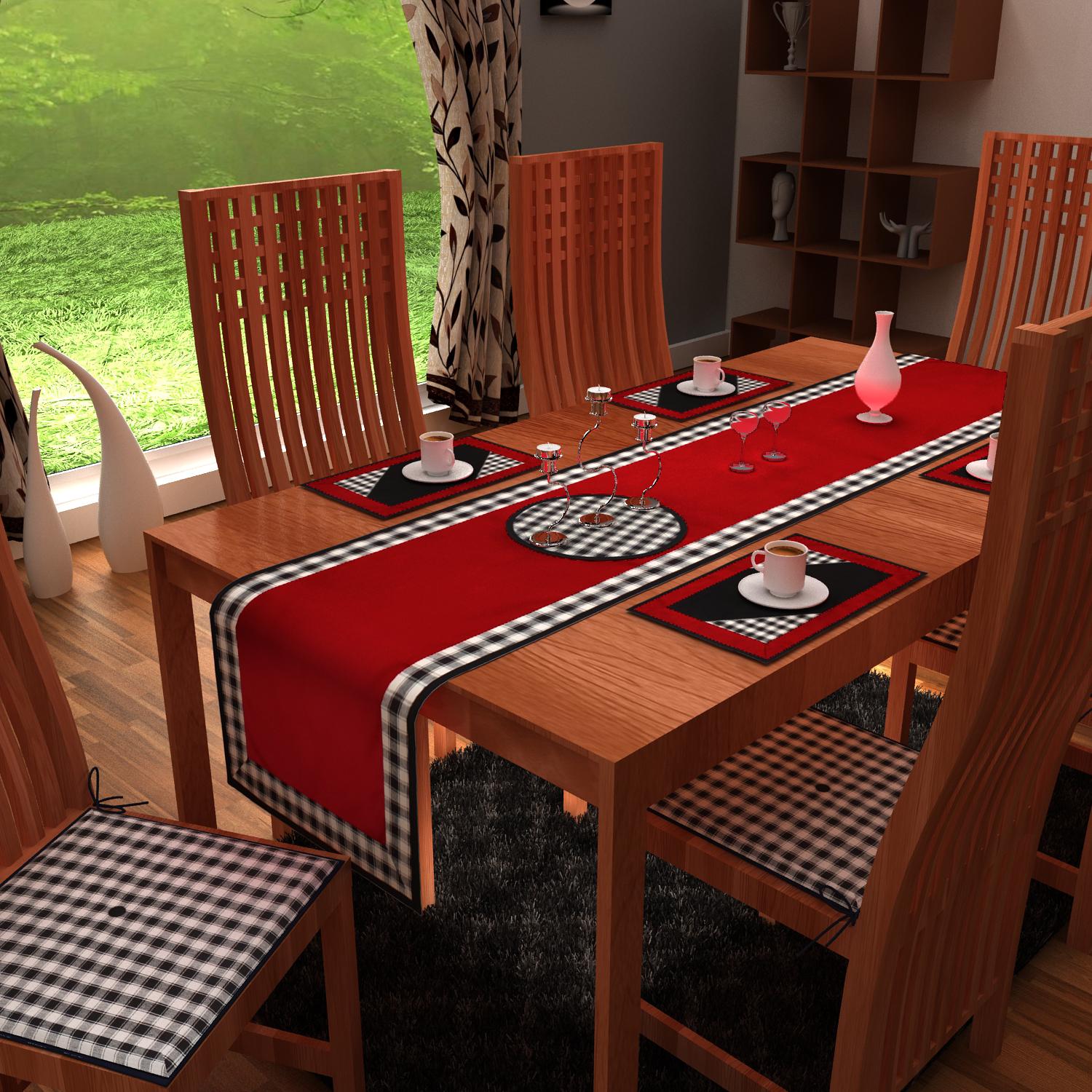 The table runner are made with Red duck cotton fabric and black white buffalo plaid border.