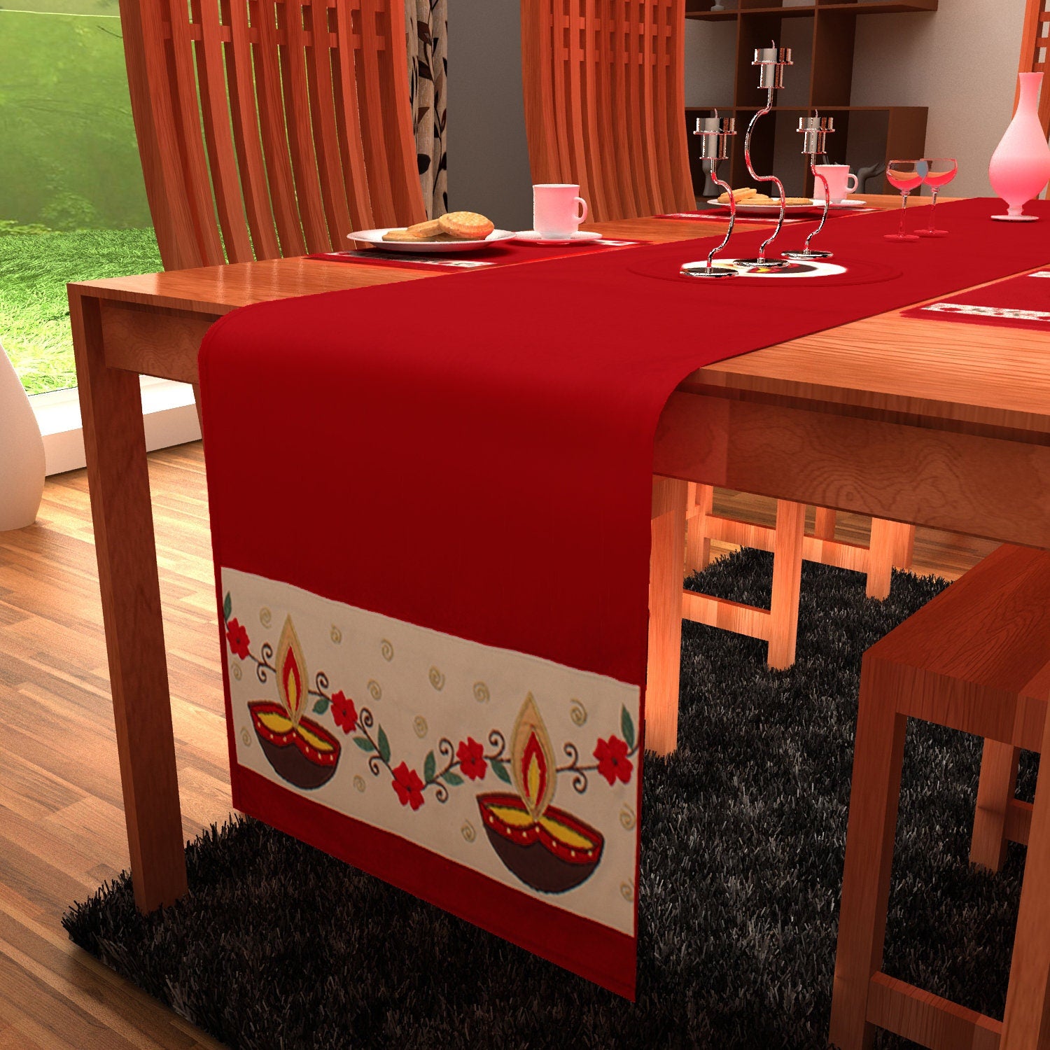 The embroidered table runner are made with red , offwhite duck cotton fabric and appliqued nicely on both the corner in Indian diya lamp pattern.