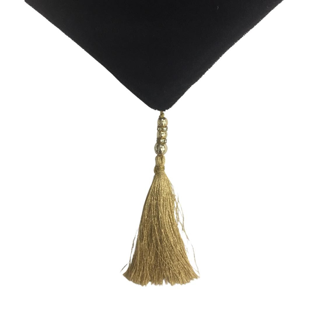 The table runner are made with red velvet fabric both side and beige tassels on both end.