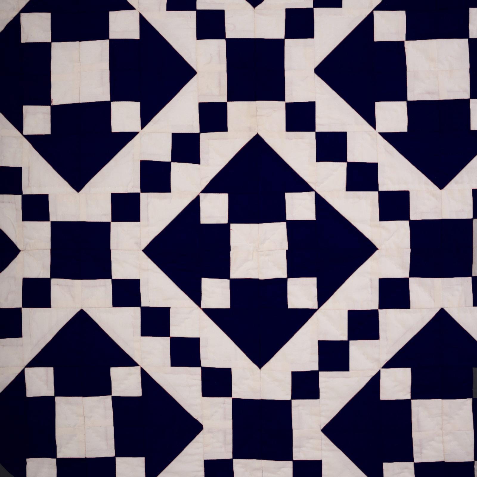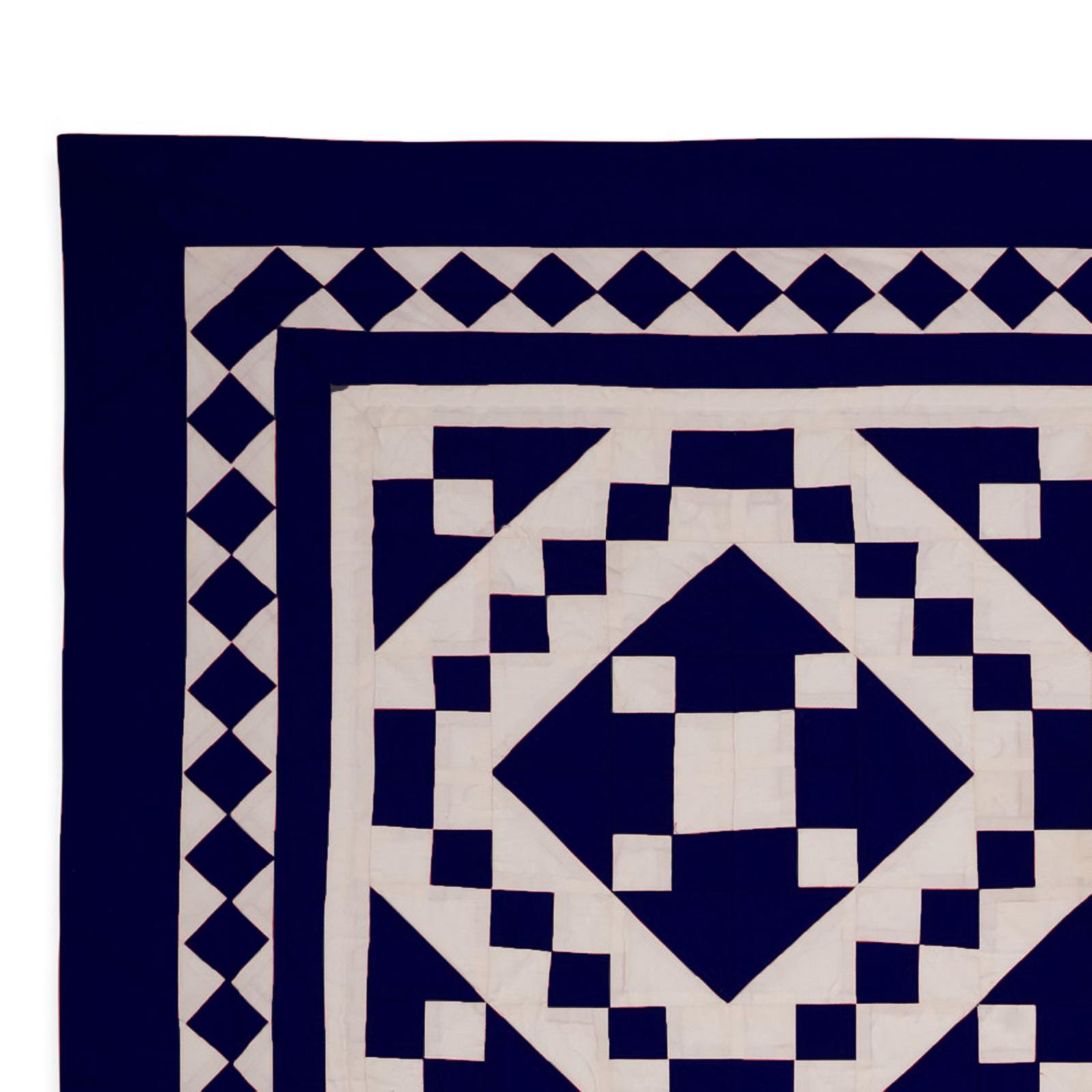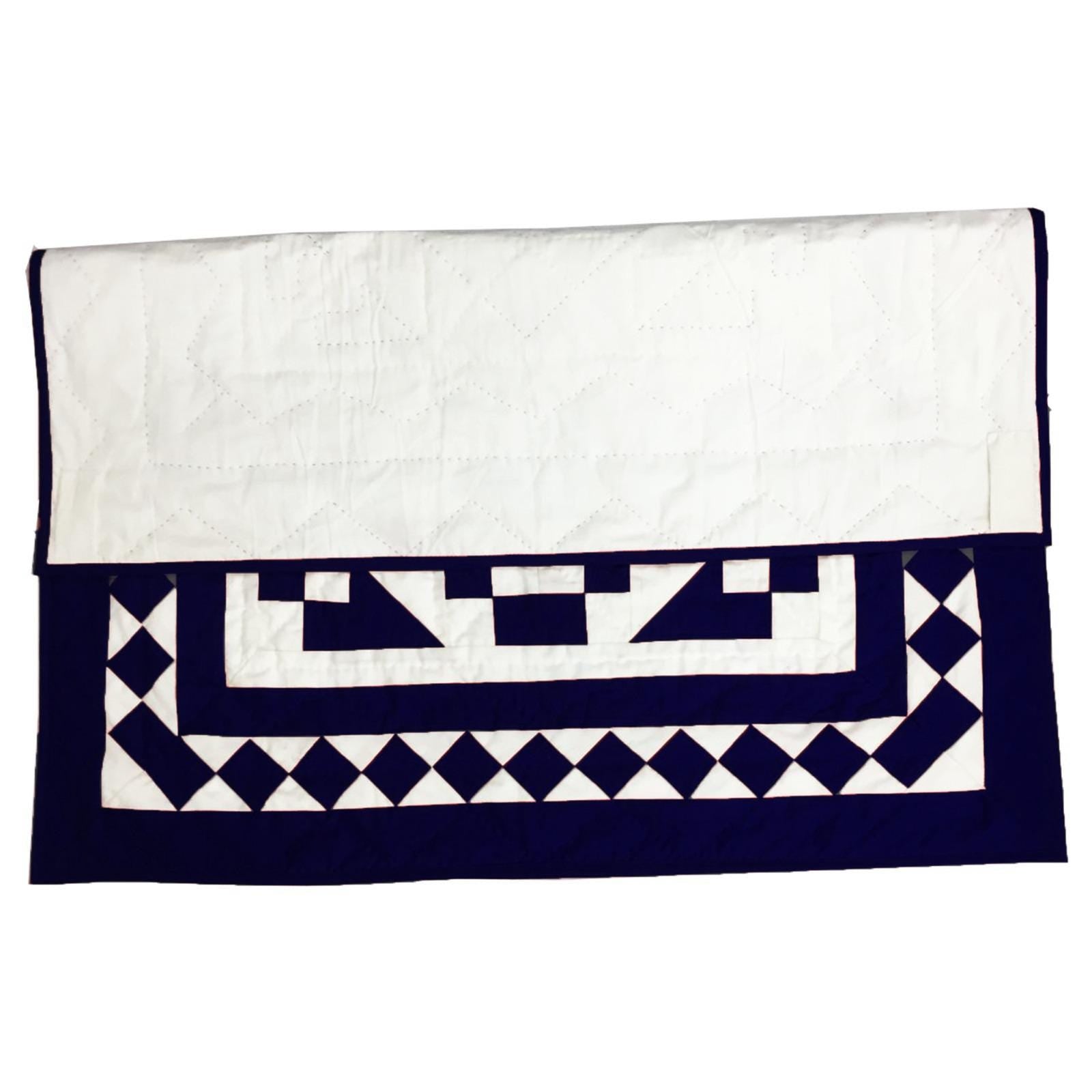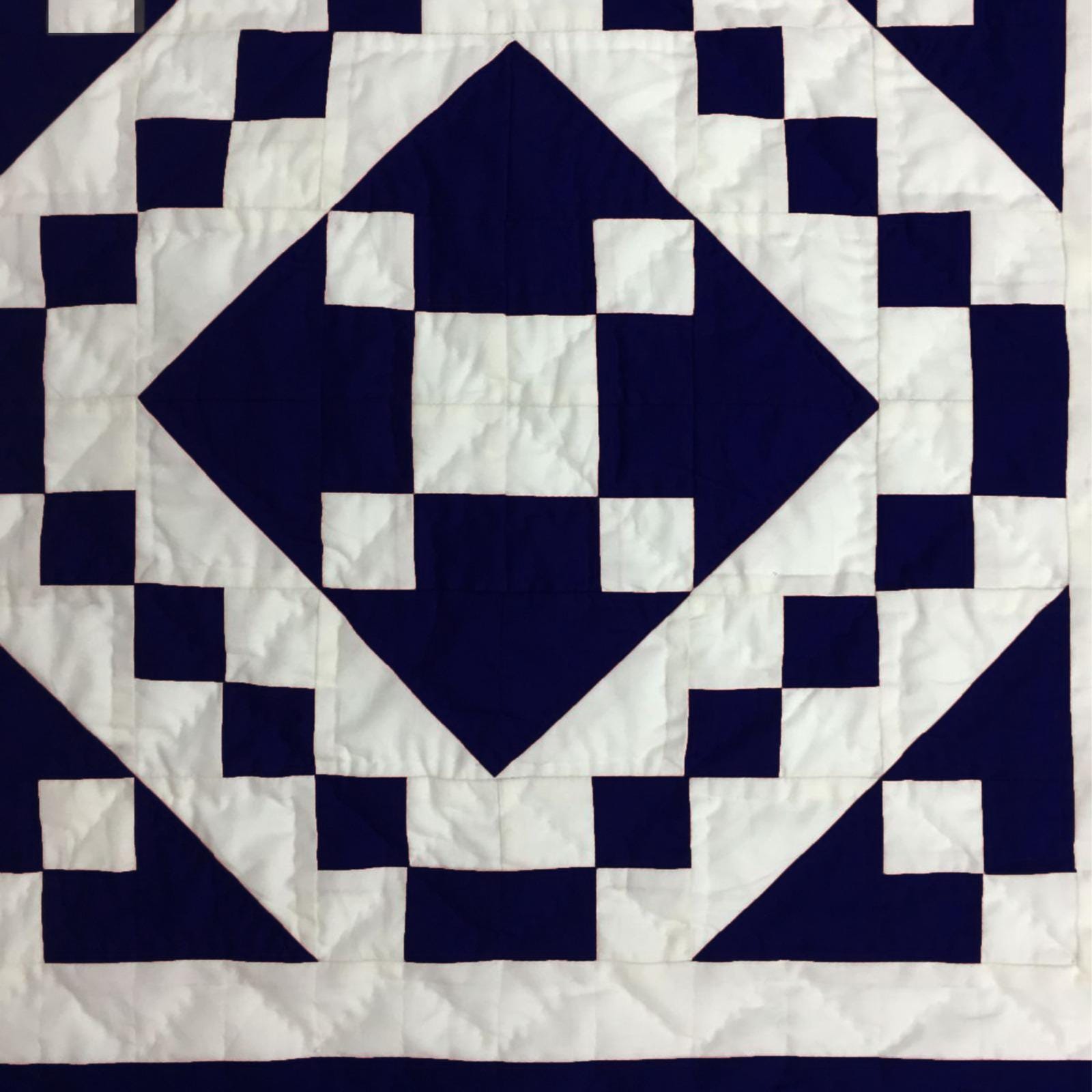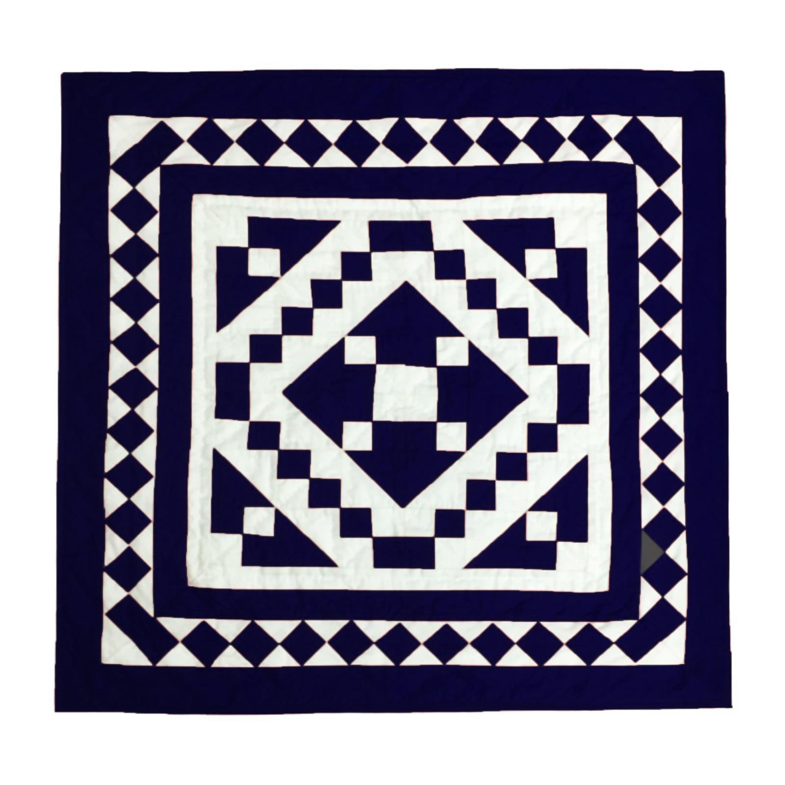 Crafted from a beautiful Patchwork of Navy blue and Off-White Calico Cotton fabric, this quilt showcases a classic Diamond and Square design.